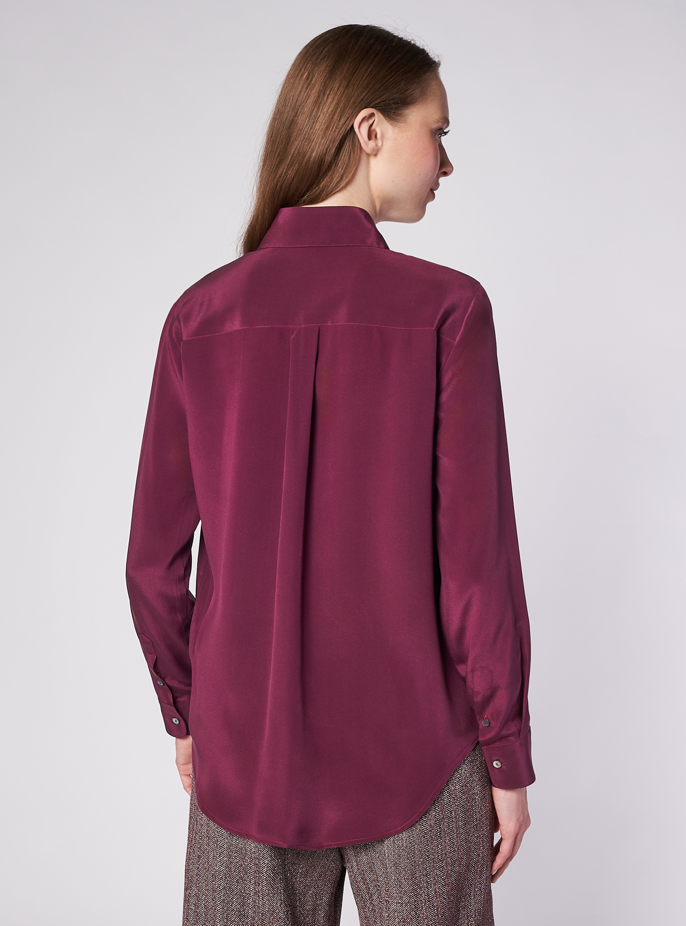 Camicia vestibilità morbida. Collo camicia . Manica regolare con polso un bottone e fessino. Carrè con cannoncino sul dietro. Camicia lunga, lunghezza fianco basso.