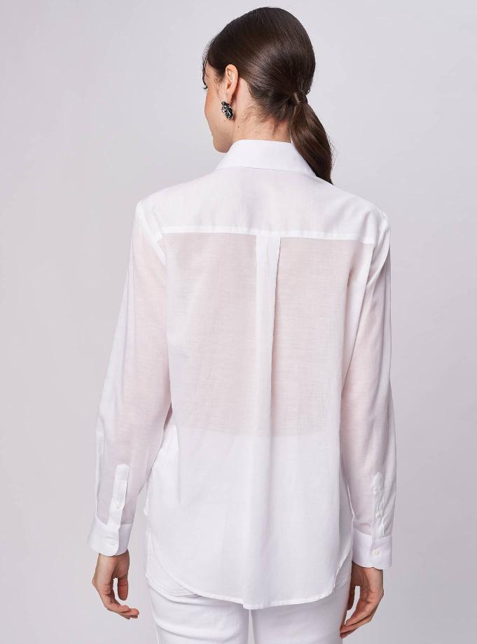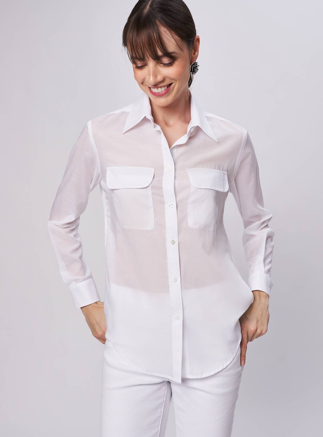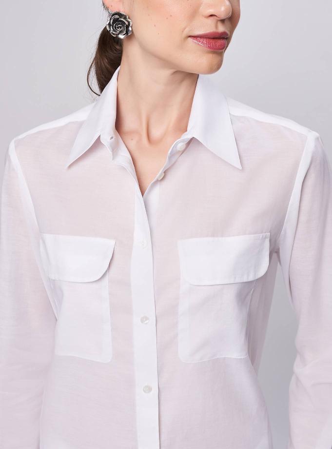 Camicia essenziale vestibilità morbida dettaglio tasche con patta. Taglio carrè dietro con cannoncino che aggiunge volume al capo.