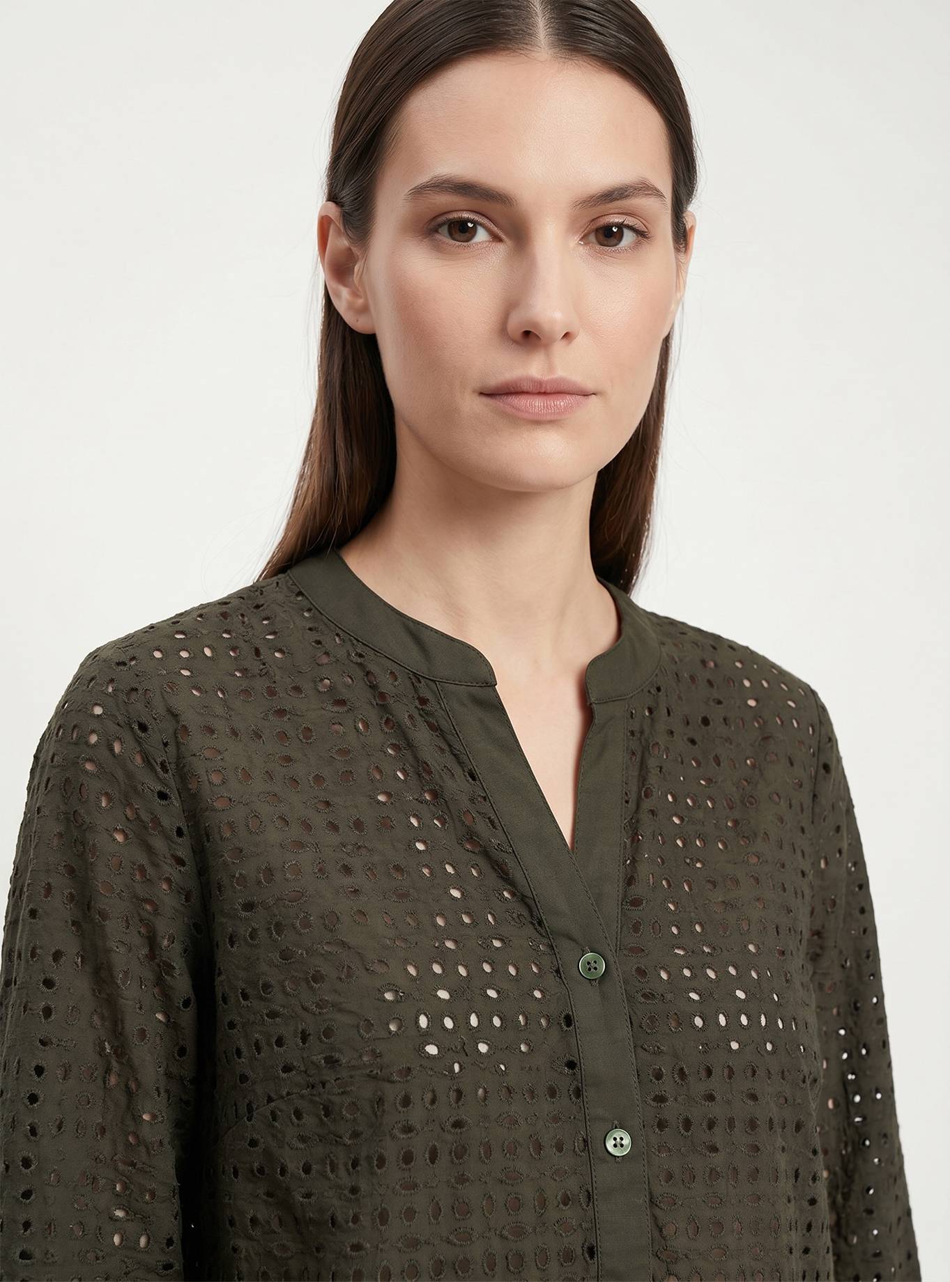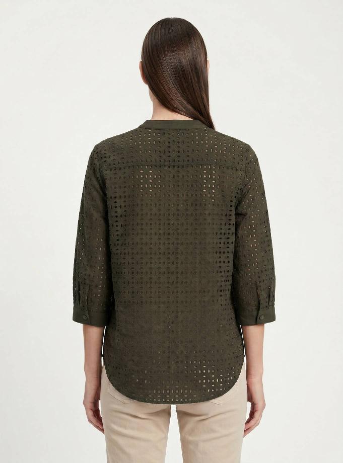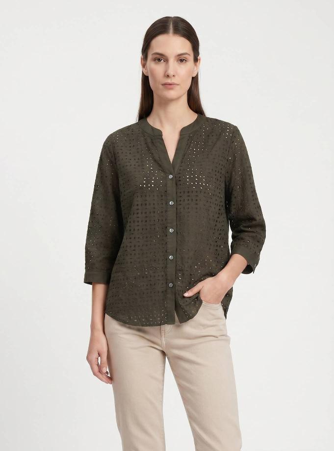Camicia vestibilità morbida. Scollo a "V" con cinturino rotondo piatto alla coreana. Spalla e manica regolare, 3/4 corto con polsino un bottone. Carrè dietro con contropiego. Lunghezza fianco alto.