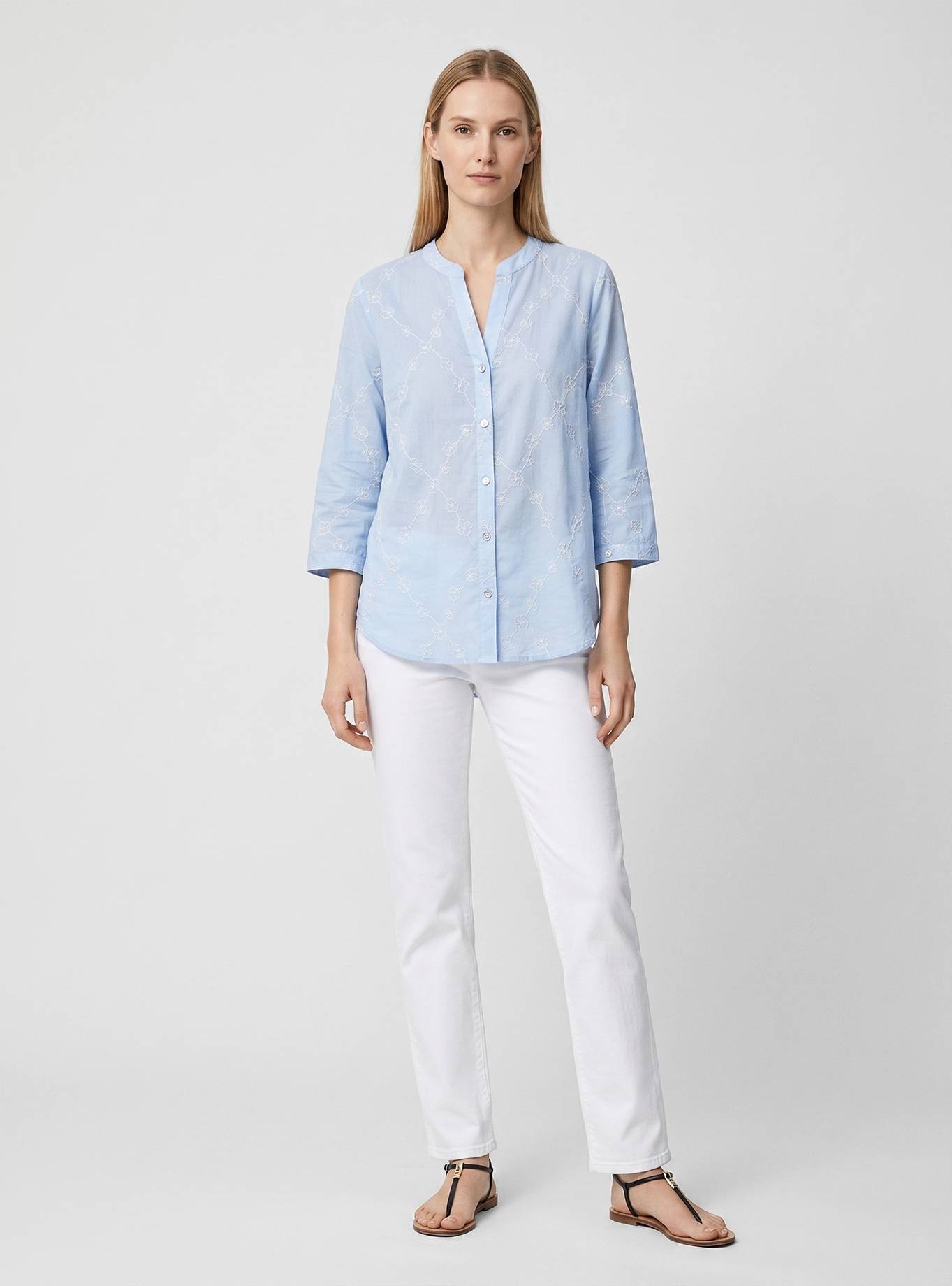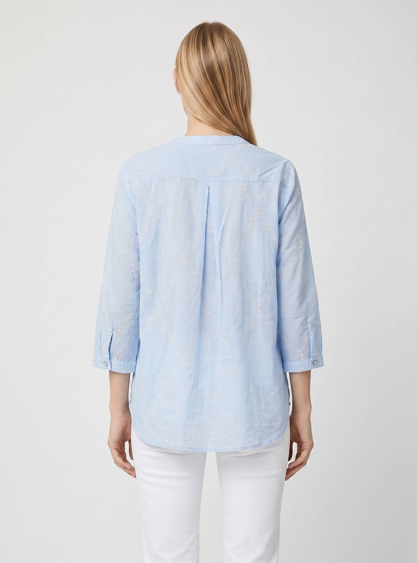 Camicia vestibilità morbida. Scollo a "V" con cinturino rotondo piatto alla coreana. Spalla e manica regolare, 3/4 corto con polsino un bottone. Carrè dietro con contropiego. Lunghezza fianco alto.