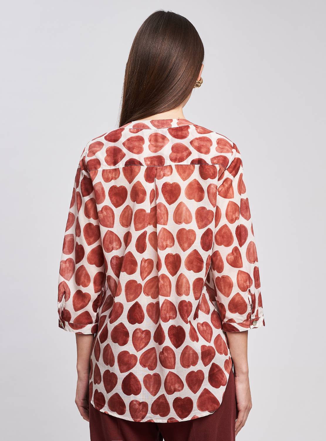 Camicia vestibilità morbida. Scollo a "V" con cinturino rotondo piatto alla coreana. Spalla e manica regolare, 3/4 corto con polsino un bottone. Carrè dietro con contropiego. Lunghezza fianco alto.