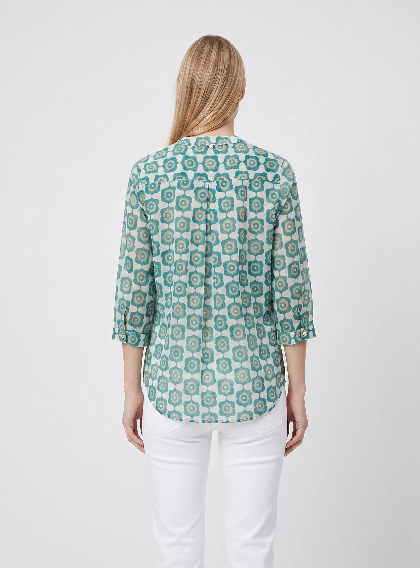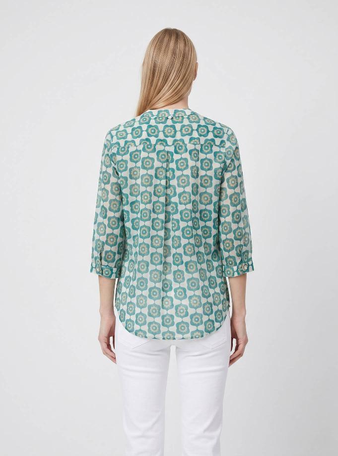 Camicia vestibilità morbida. Scollo a "V" con cinturino rotondo piatto alla coreana. Spalla e manica regolare, 3/4 corto con polsino un bottone. Carrè dietro con contropiego. Lunghezza fianco alto.