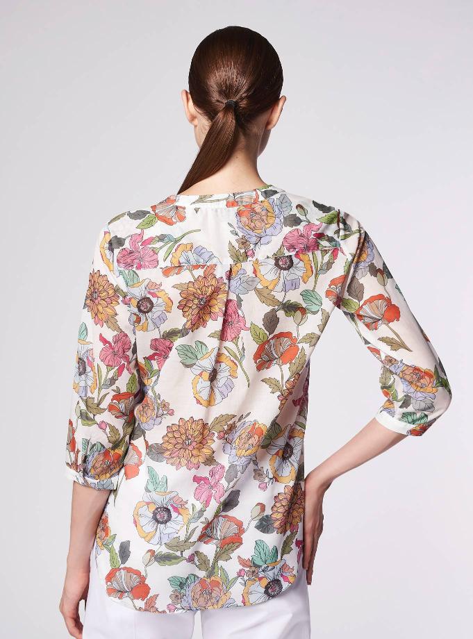 Camicia vestibilità morbida. Scollo a "V" con cinturino rotondo piatto alla coreana. Spalla e manica regolare, 3/4 corto con polsino un bottone. Carrè dietro con contropiego. Lunghezza fianco alto.