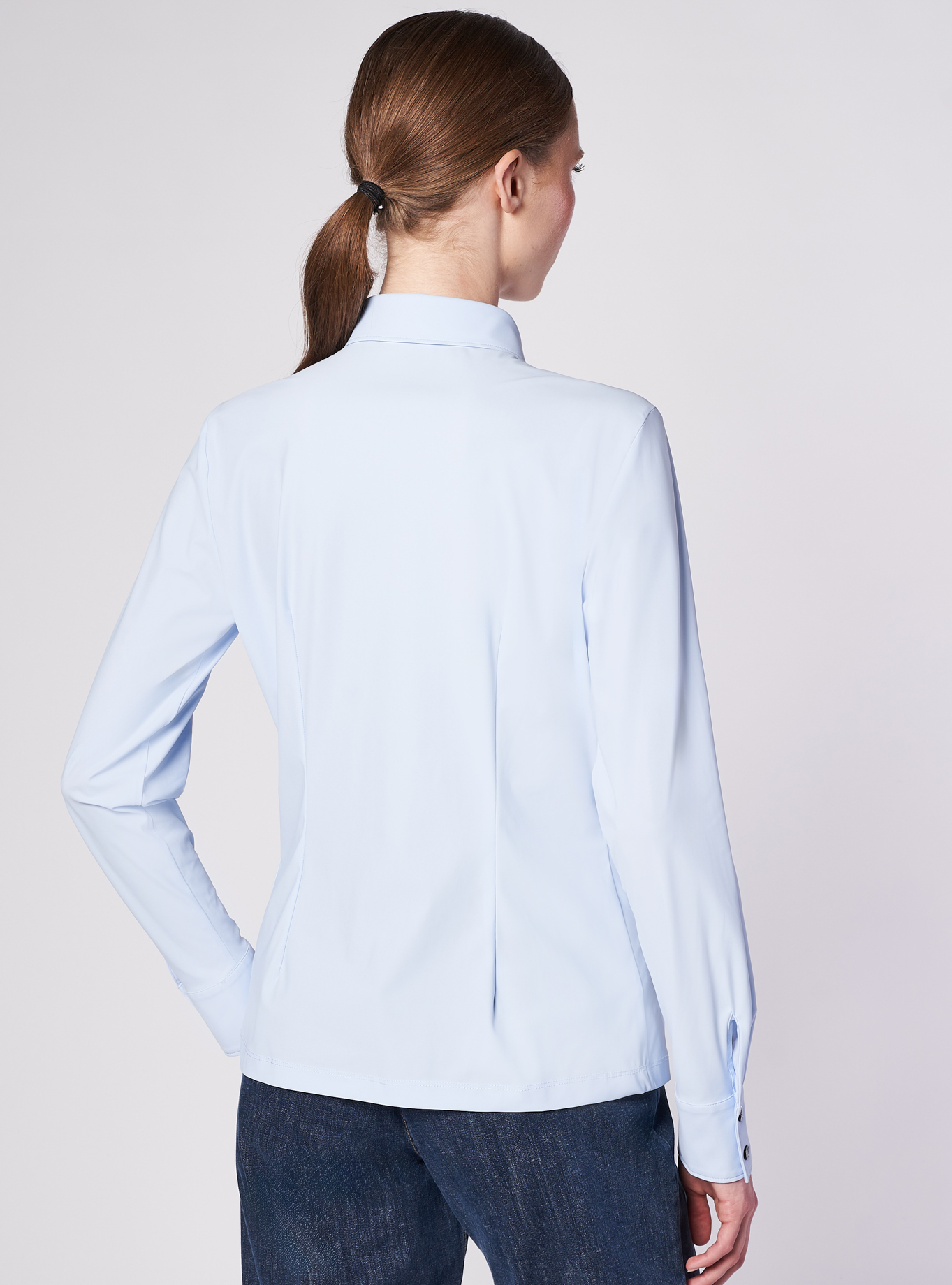 Camicia vestibilità aderente. Collo a camicia. Manica regolare, polso con due bottoni. Pinces sul dietro. Camicia medio corta, lunghezza fianco medio corto.