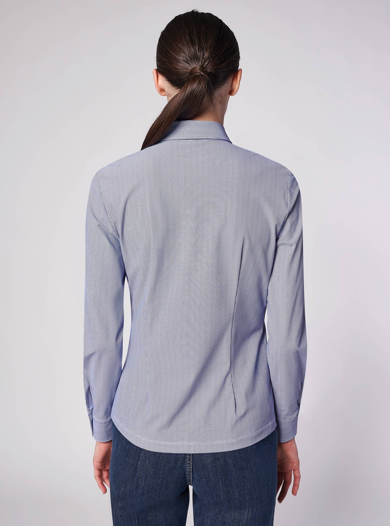 Camicia vestibilità aderente. Collo a camicia. Manica regolare, polso con due bottoni. Pinces sul dietro. Camicia medio corta, lunghezza fianco medio corto.