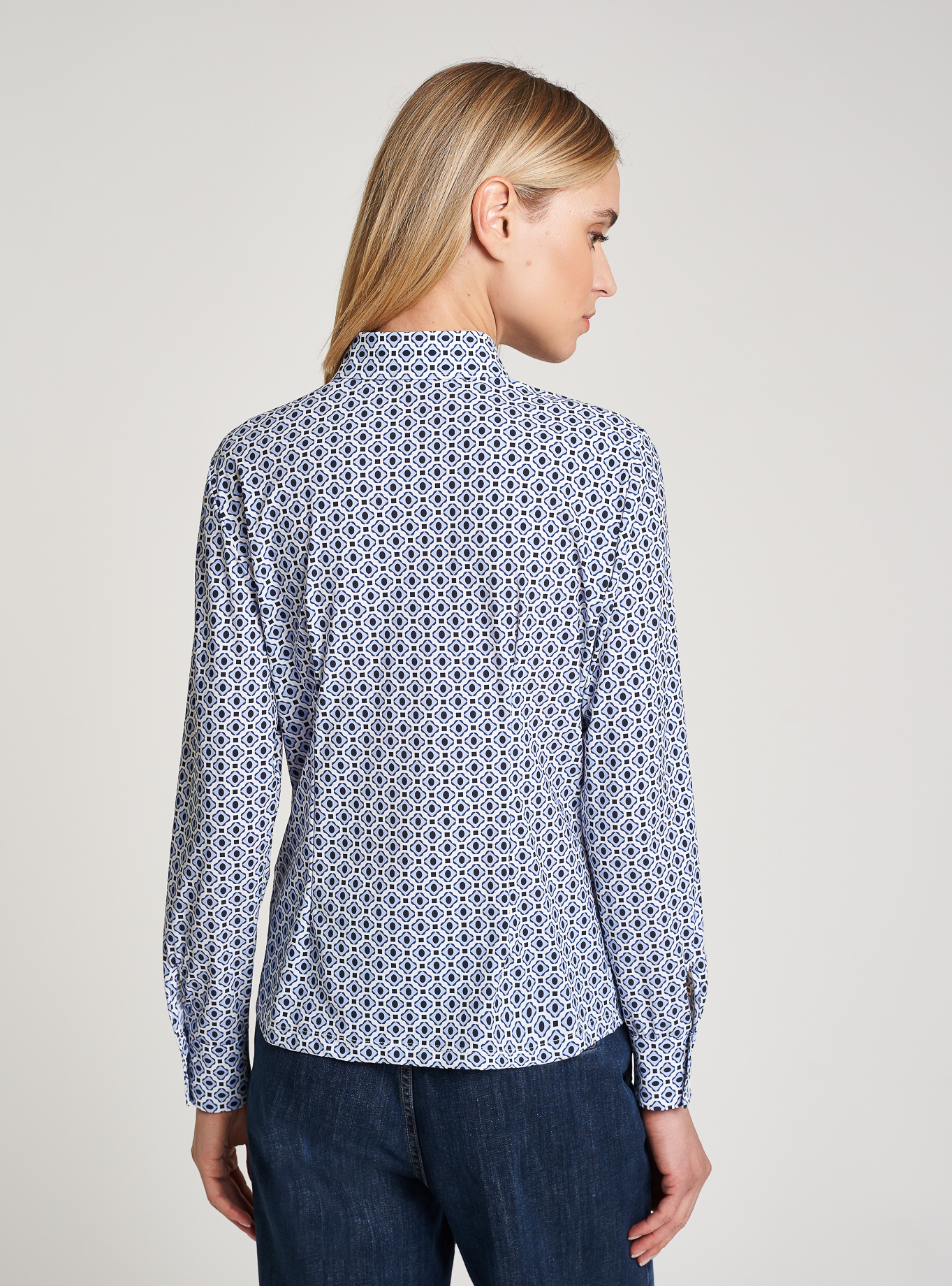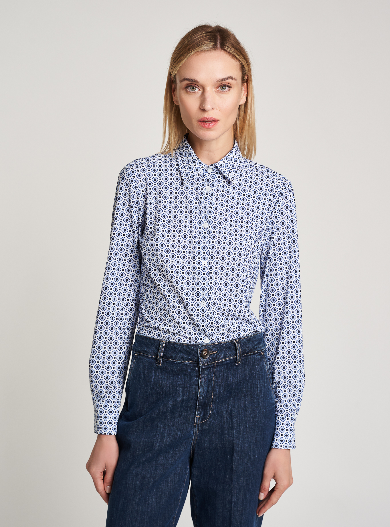 Camicia vestibilità aderente. Collo a camicia. Manica regolare, polso con due bottoni. Pinces sul dietro. Camicia medio corta, lunghezza fianco medio corto.