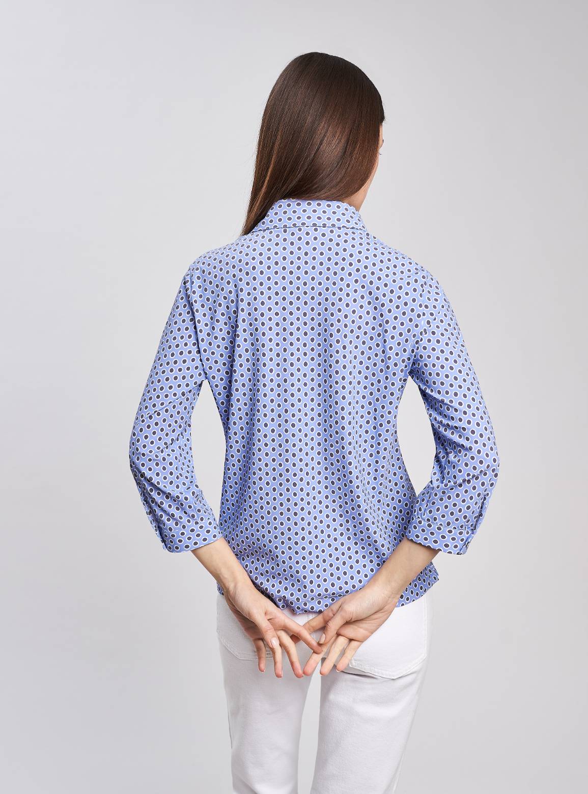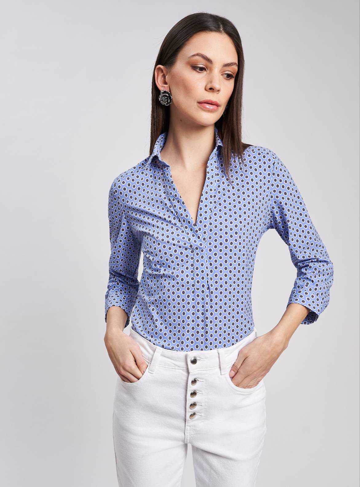 Polo vestibilità morbida. Collo a camicia, scollo a "V" femminile, manica regolare lunghezza 3/4 con polsino e spacchetto laterale, pari al fondo. Lunghezza fianco alto.
