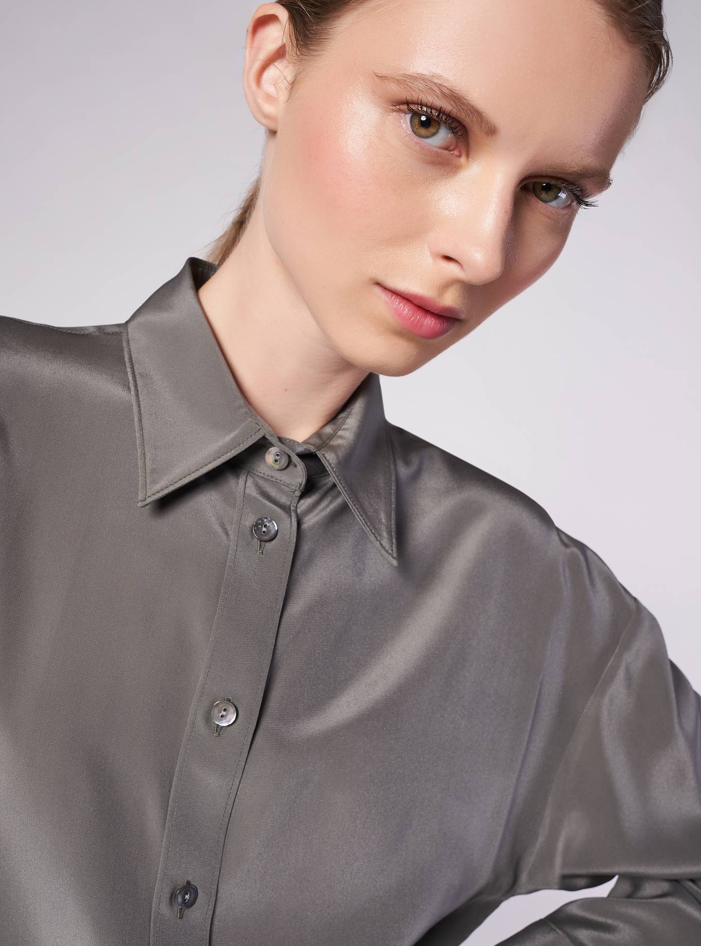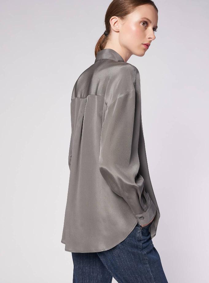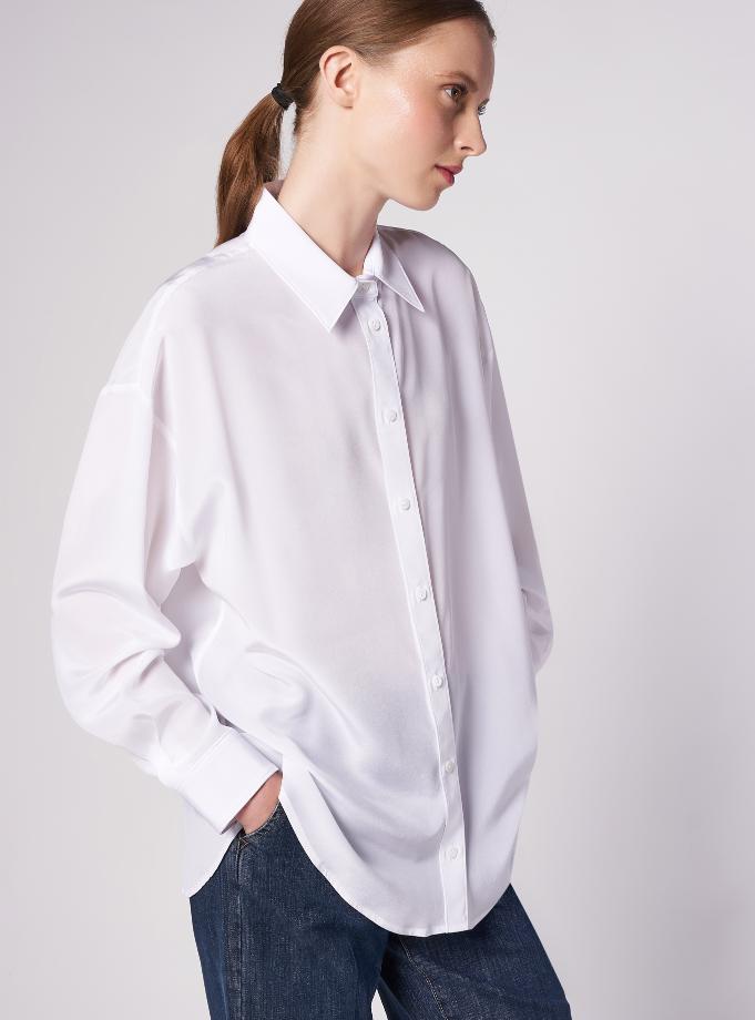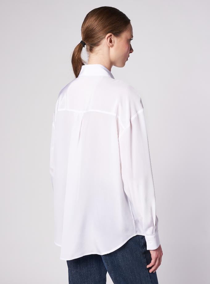 Camicia vestibilità oversize. Collo a camicia. Spalla scesa con giro basso, manica morbida con polsino un bottone. Carrè dietro con cannoncino. Camicia lunga, lunghezza fianco basso, fondo asimmetrico con dislivello davanti/dietro.