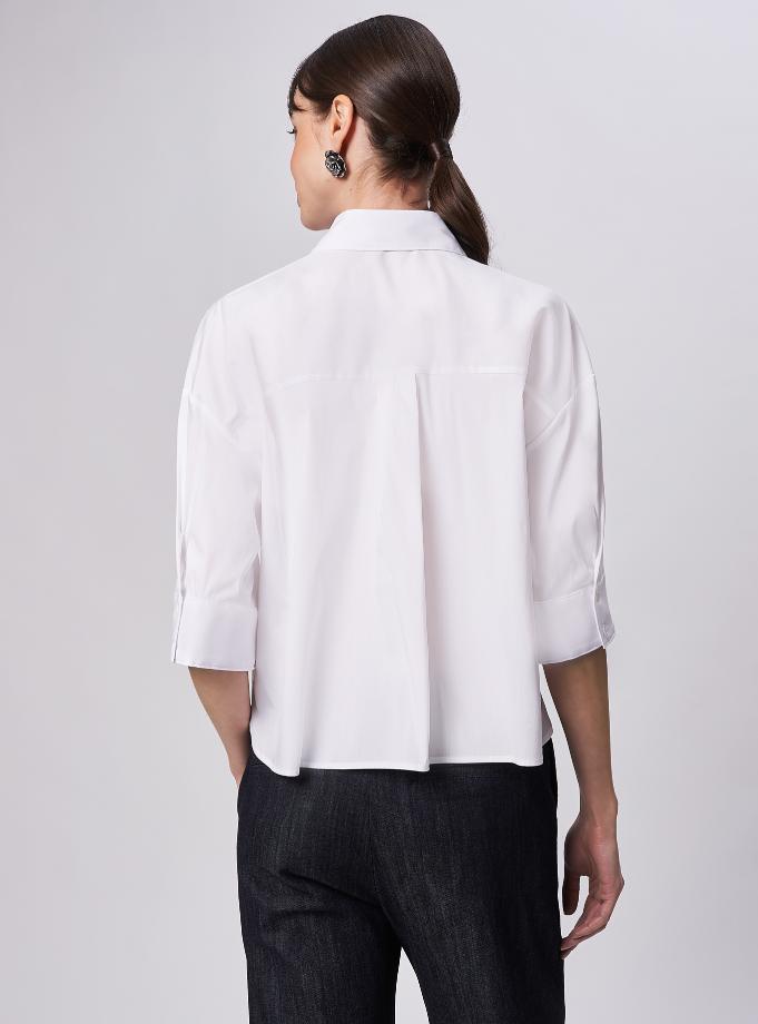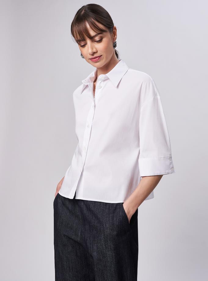 Camicia oversize, spacchi arrotondati al fondo. Spalla scesa con manica corta ampia e polso alto 2 bottoni. Taglio carrè dietro doppio di tessuto con cannoncino che conferisce volume al capo. Lunghezza vita alta.