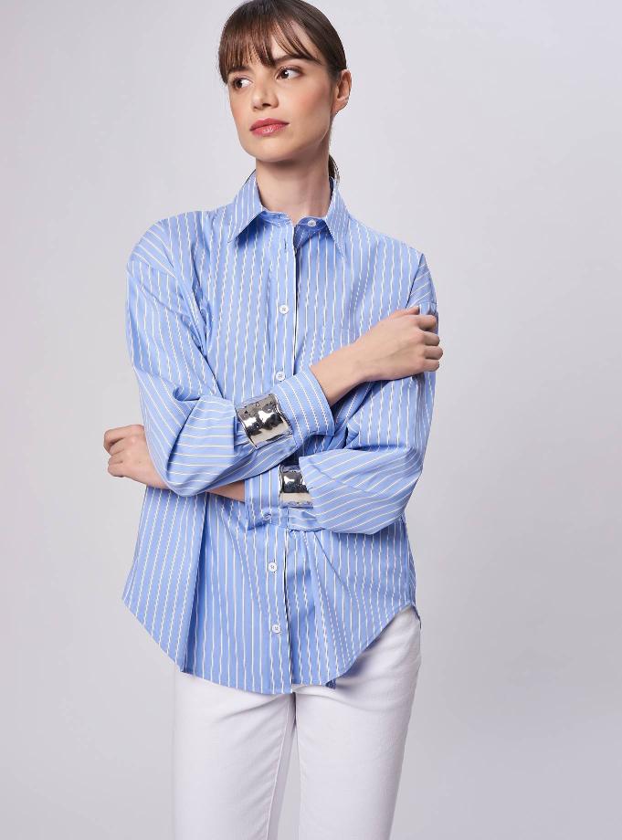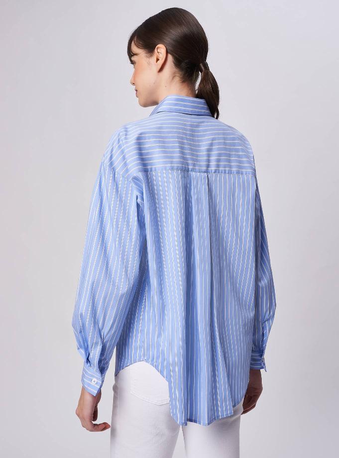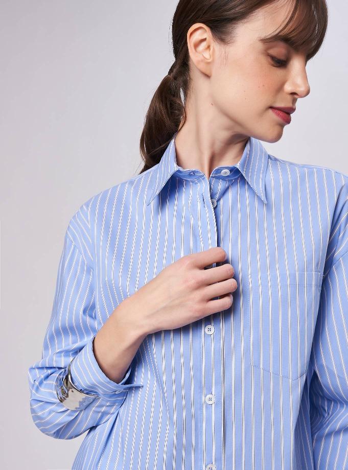 Camicia maschile oversize. Spalla leggermente scesa, collo a camicia, manica lunga con polso un bottone. Taschino sul davanti sinistro. Taglio carrè dietro con profondo contropiego per dare volume. Orlo stondato. Lunghezza fianco basso.