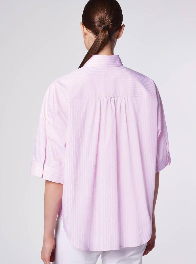 Camicia oversize, spalla scesa, ampia manica corta. Collo a camicia, carrè davanti e dietro, tasca squadrata nella parte sinistra. Arriccio sul dietro per dare volume. Orlo stondato leggermente asimmetrico.