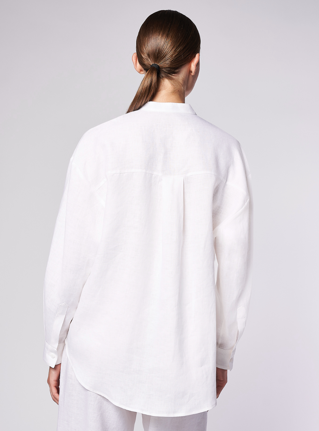 Camicia oversize, spalla scesa, manica lunga con polso e un bottone. Scollo alla coreana. Allacciatura con un bottone. Carrè dietro con cannoncino. Orlo stondato.