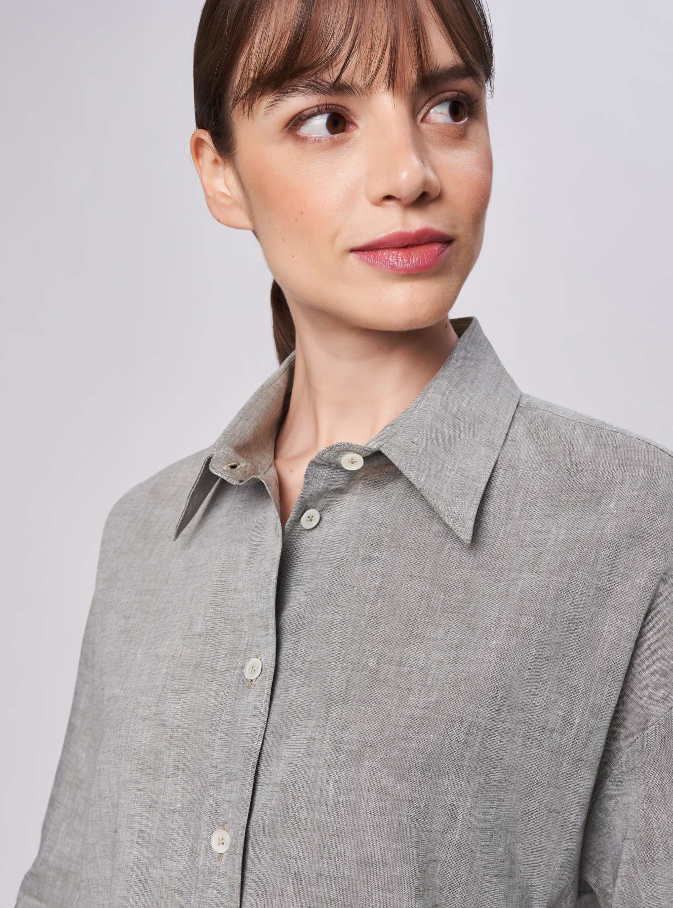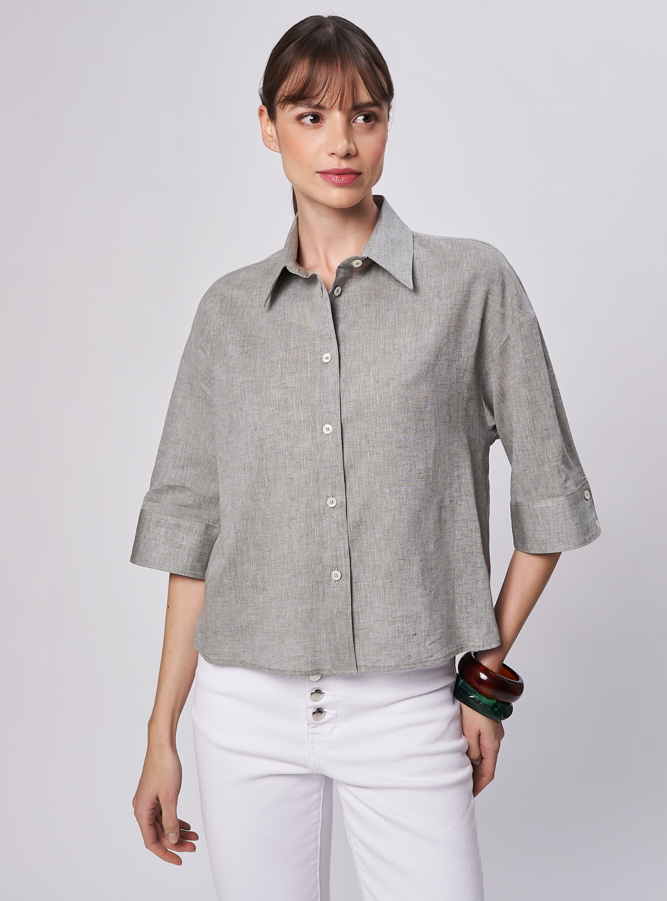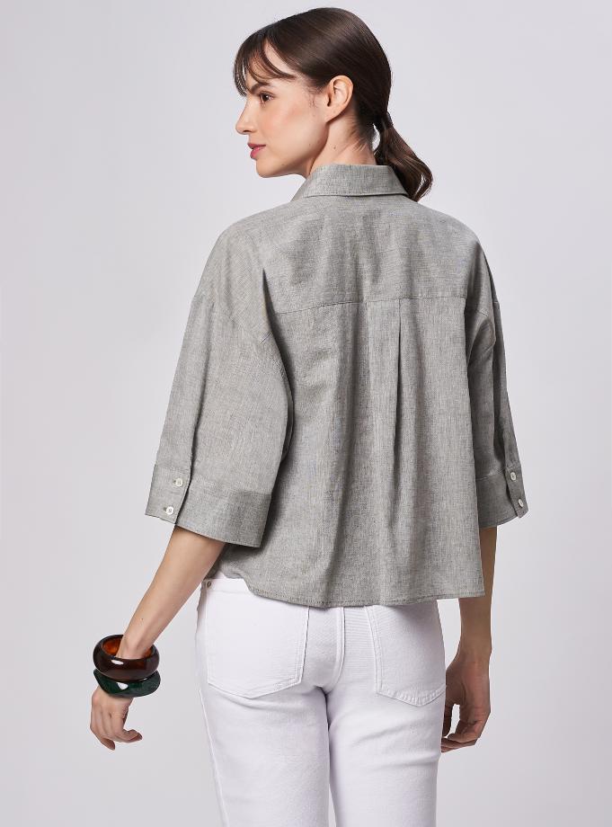 Camicia oversize, spacchi arrotondati al fondo. Spalla scesa con manica corta ampia e polso alto 2 bottoni. Taglio carrè dietro doppio di tessuto con cannoncino che conferisce volume al capo. Lunghezza vita alta.