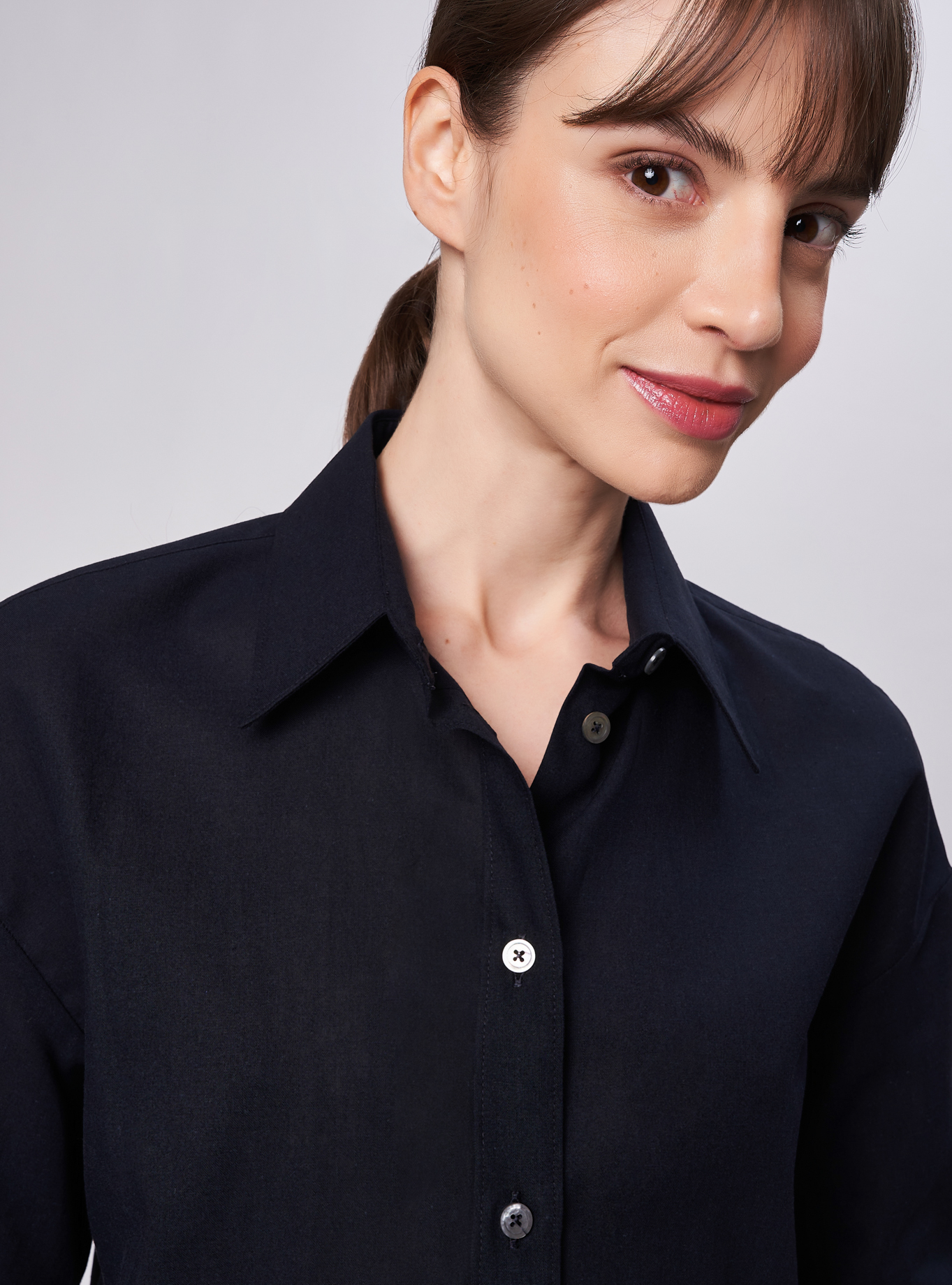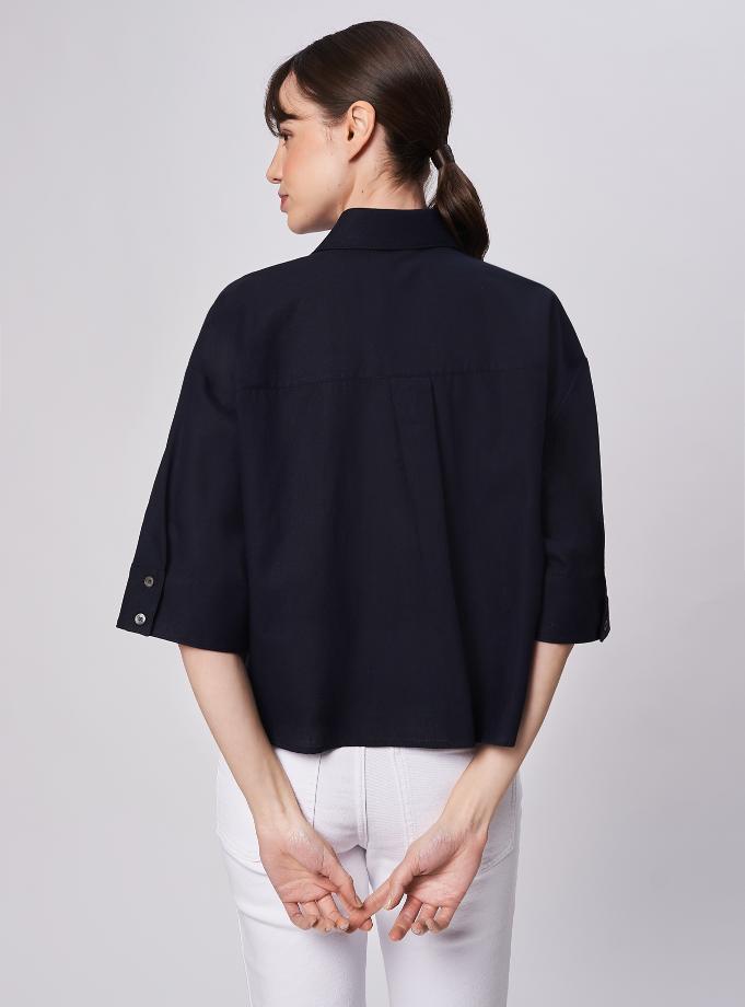 Camicia oversize, spacchi arrotondati al fondo. Spalla scesa con manica corta ampia e polso alto 2 bottoni. Taglio carrè dietro doppio di tessuto con cannoncino che conferisce volume al capo. Lunghezza vita alta.