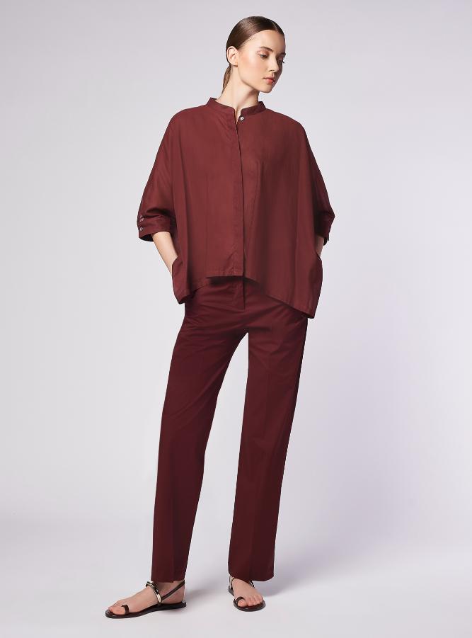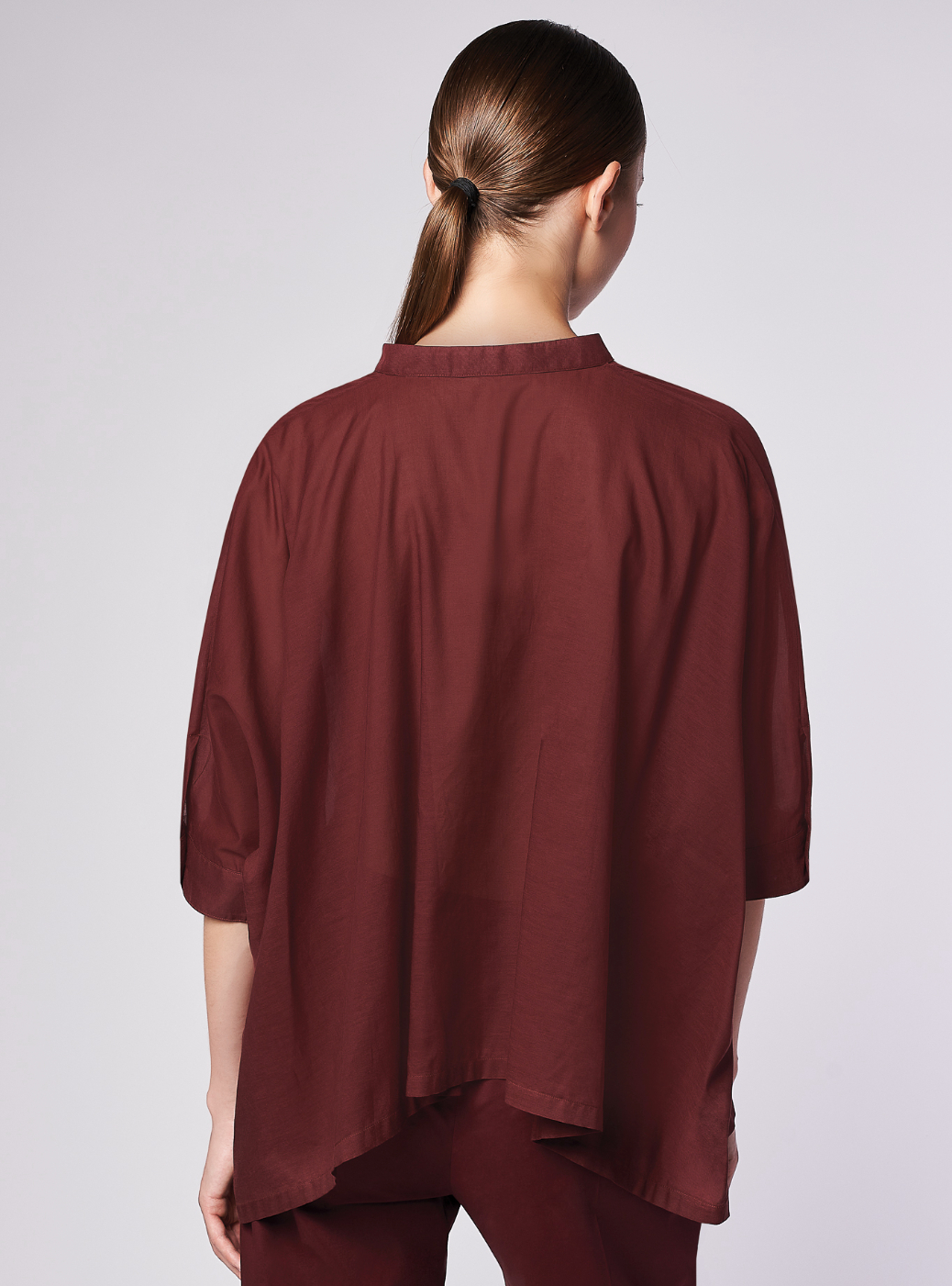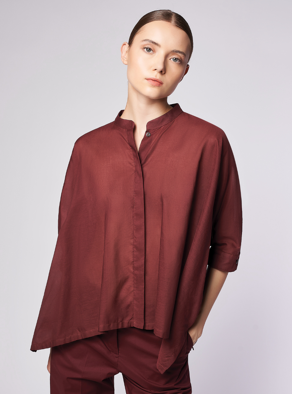 Camicia vestibilità oversize, volume ampio. Manica a kimono, lunghezza 3/4, con polso 1 bottone. Collo alla coreana e allacciatura davanti all'inglese con bottoni nascosti. Lunghezza fianco basso.