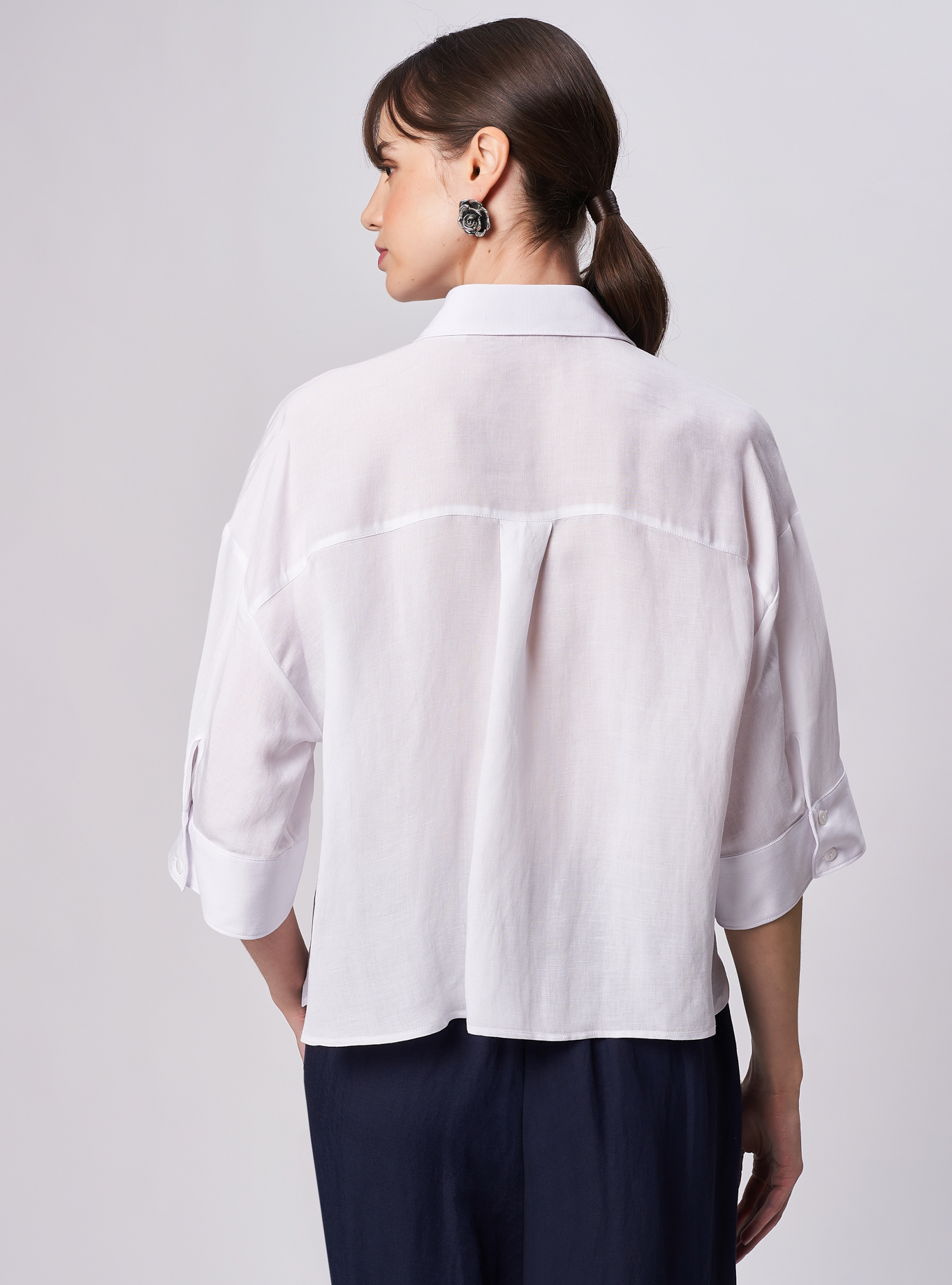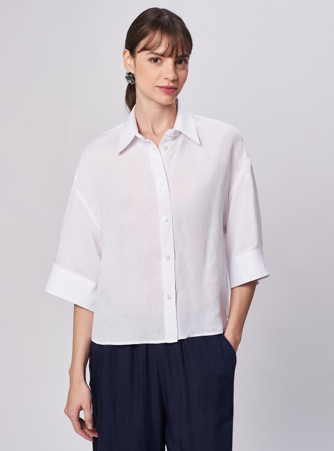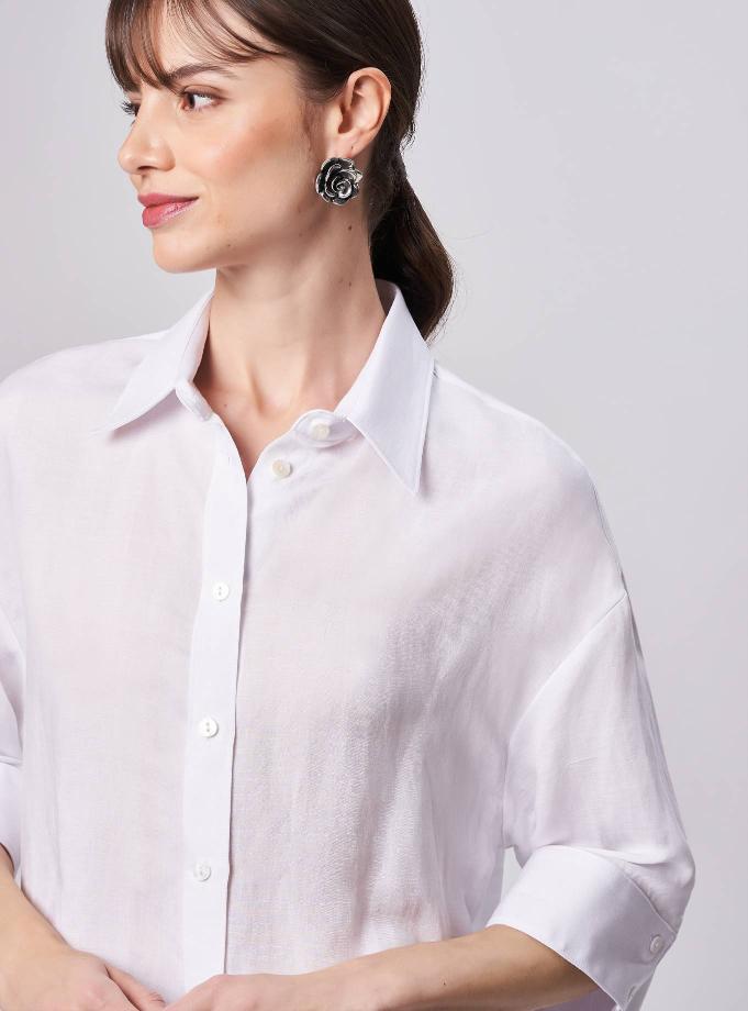 Camicia oversize, spacchi arrotondati al fondo. Spalla scesa con manica corta ampia e polso alto 2 bottoni. Taglio carrè dietro doppio di tessuto con cannoncino che conferisce volume al capo. Lunghezza vita alta.