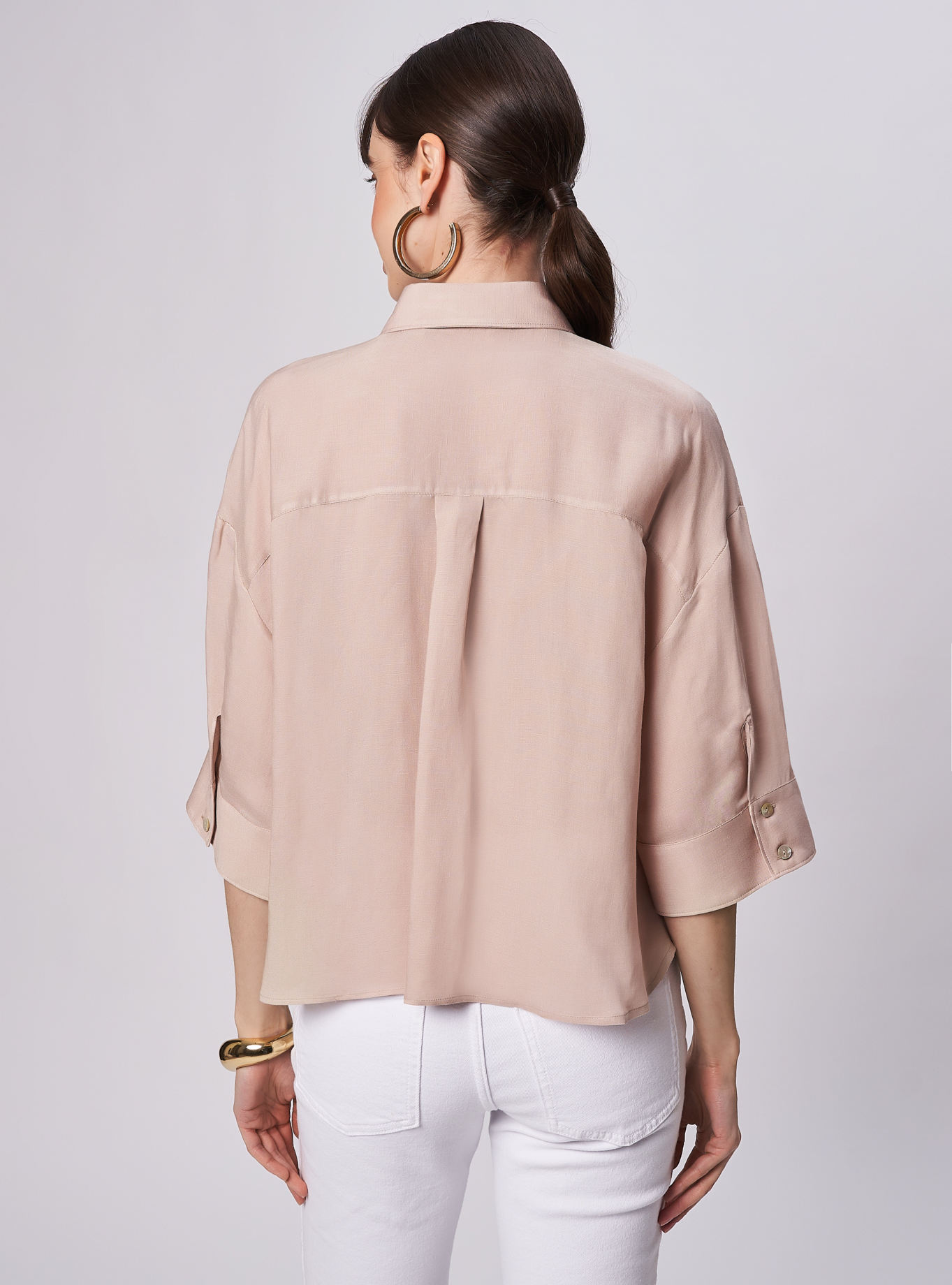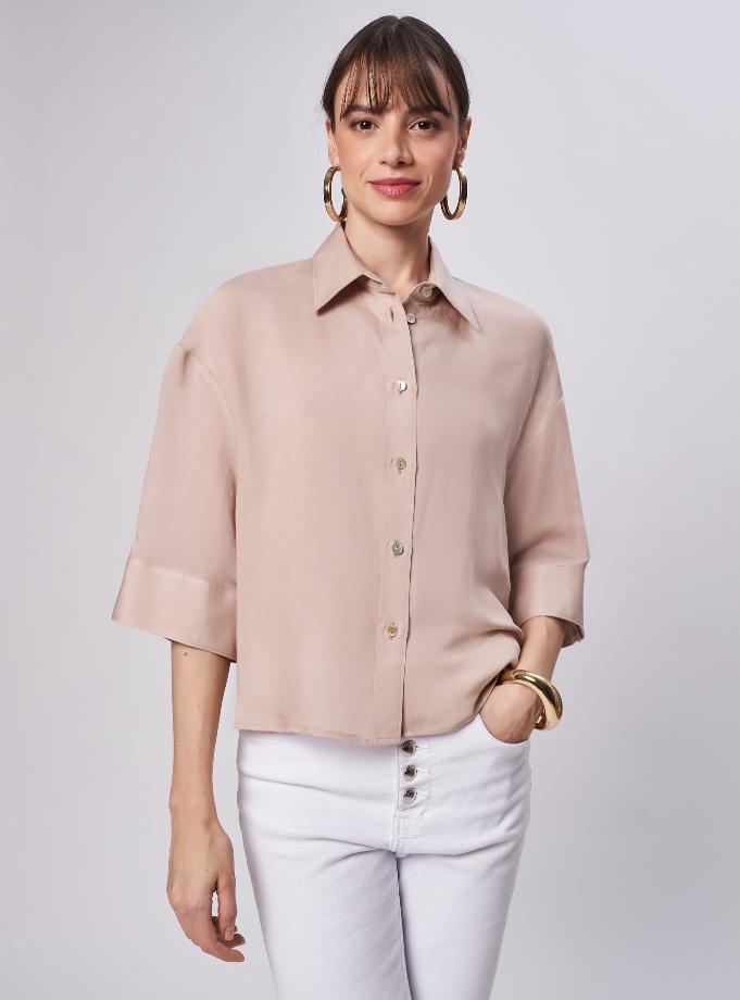Camicia oversize, spacchi arrotondati al fondo. Spalla scesa con manica corta ampia e polso alto 2 bottoni. Taglio carrè dietro doppio di tessuto con cannoncino che conferisce volume al capo. Lunghezza vita alta.