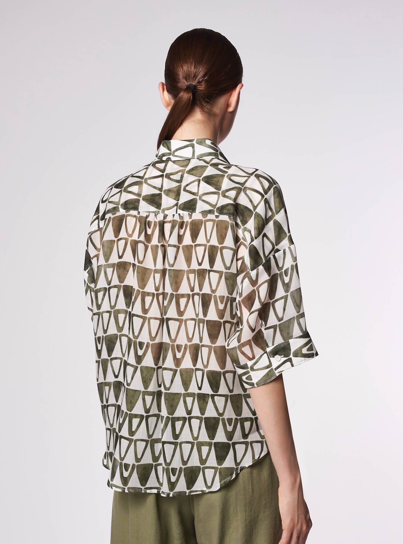 Camicia oversize, spalla scesa, ampia manica corta. Collo a camicia, carrè davanti e dietro, tasca squadrata nella parte sinistra. Arriccio sul dietro per dare volume. Orlo stondato leggermente asimmetrico.