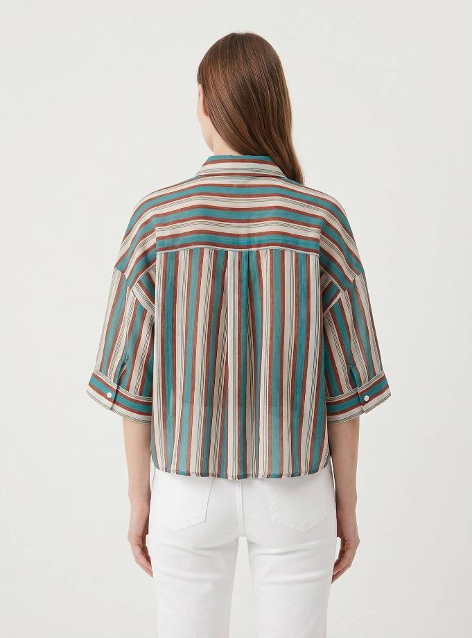 Camicia oversize, spalla scesa, ampia manica corta. Collo a camicia, carrè davanti e dietro, tasca squadrata nella parte sinistra. Arriccio sul dietro per dare volume. Orlo stondato leggermente asimmetrico.