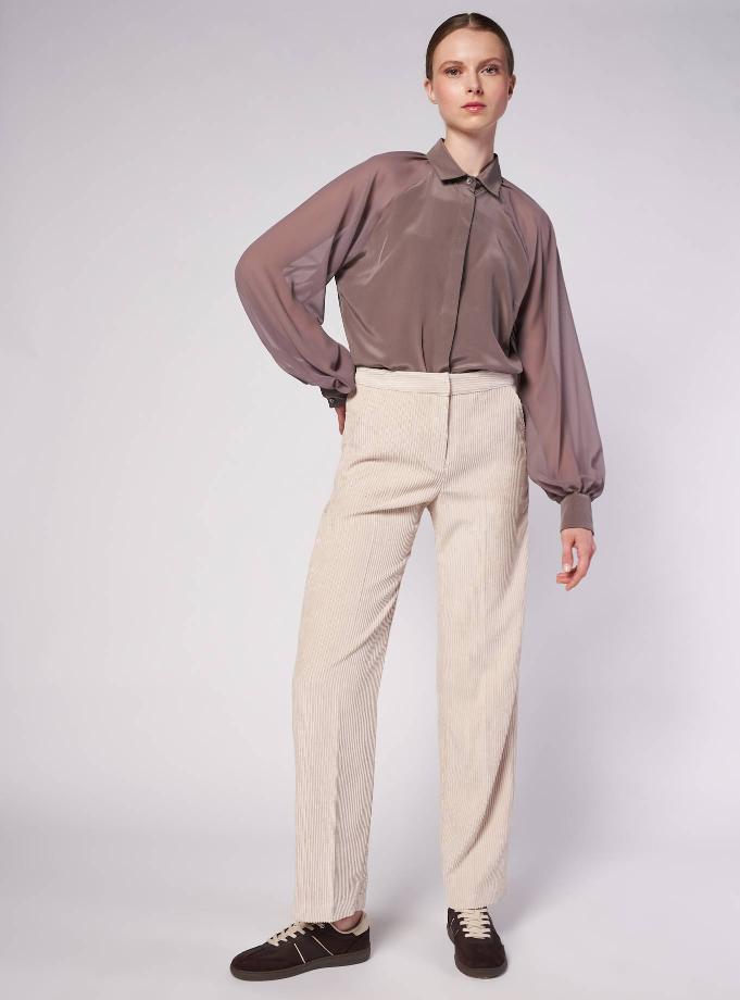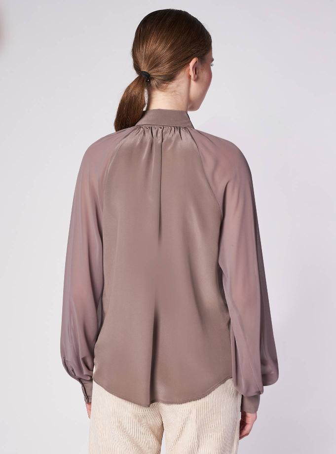 Camicia vestibilità morbida. Collo a camicia, abbottonatura nascosta. Maniche ampie a raglan leggermente arricciate all'attaccatua polso per conferire volume. Polso con due bottoni. Orlo stondato. Lunghezza fianco basso. Maniche in tessuto trasparente in tono.