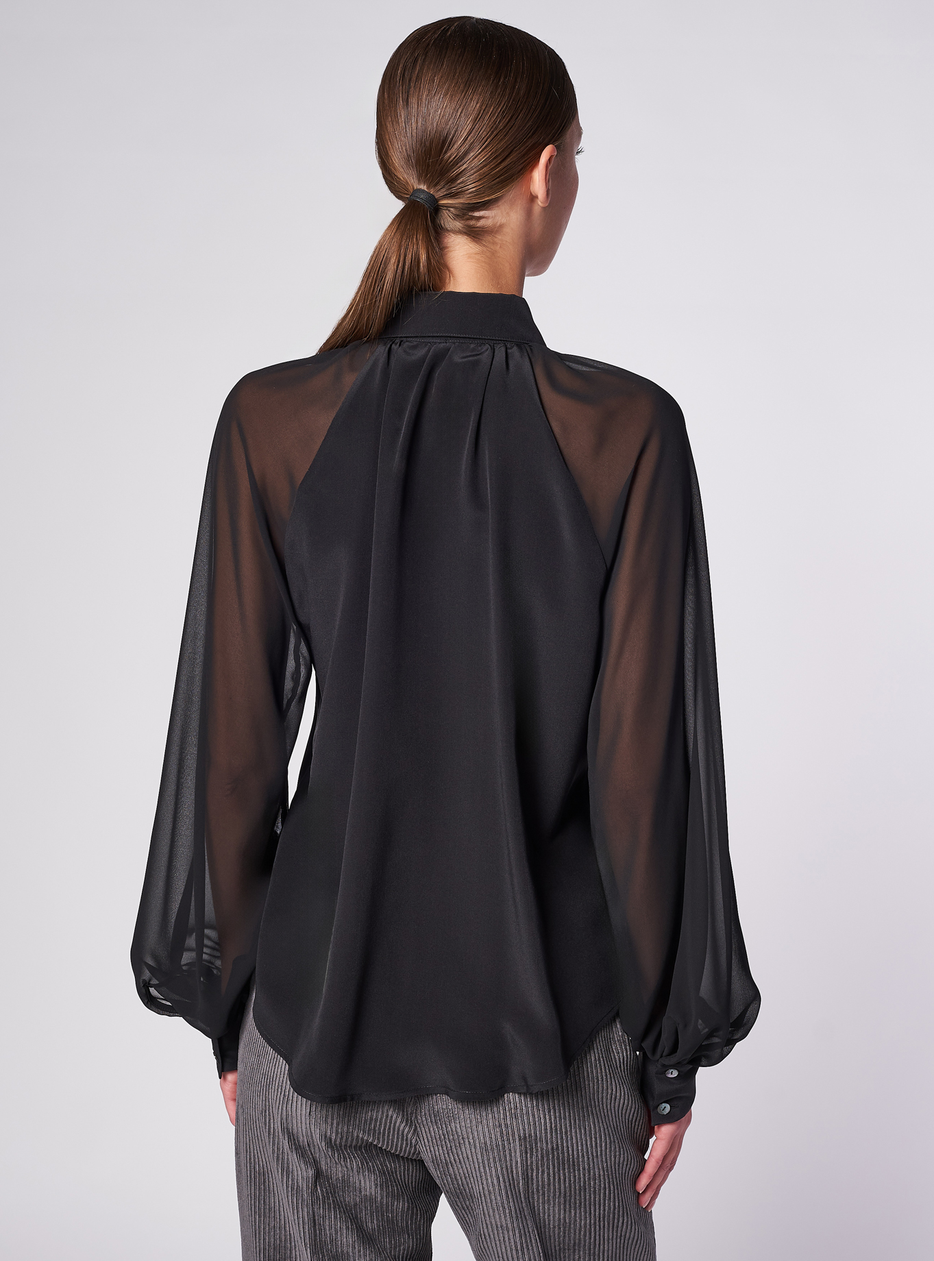 Camicia vestibilità morbida. Collo a camicia, abbottonatura nascosta. Maniche ampie a raglan leggermente arricciate all'attaccatua polso per conferire volume. Polso con due bottoni. Orlo stondato. Lunghezza fianco basso. Maniche in tessuto trasparente in tono.