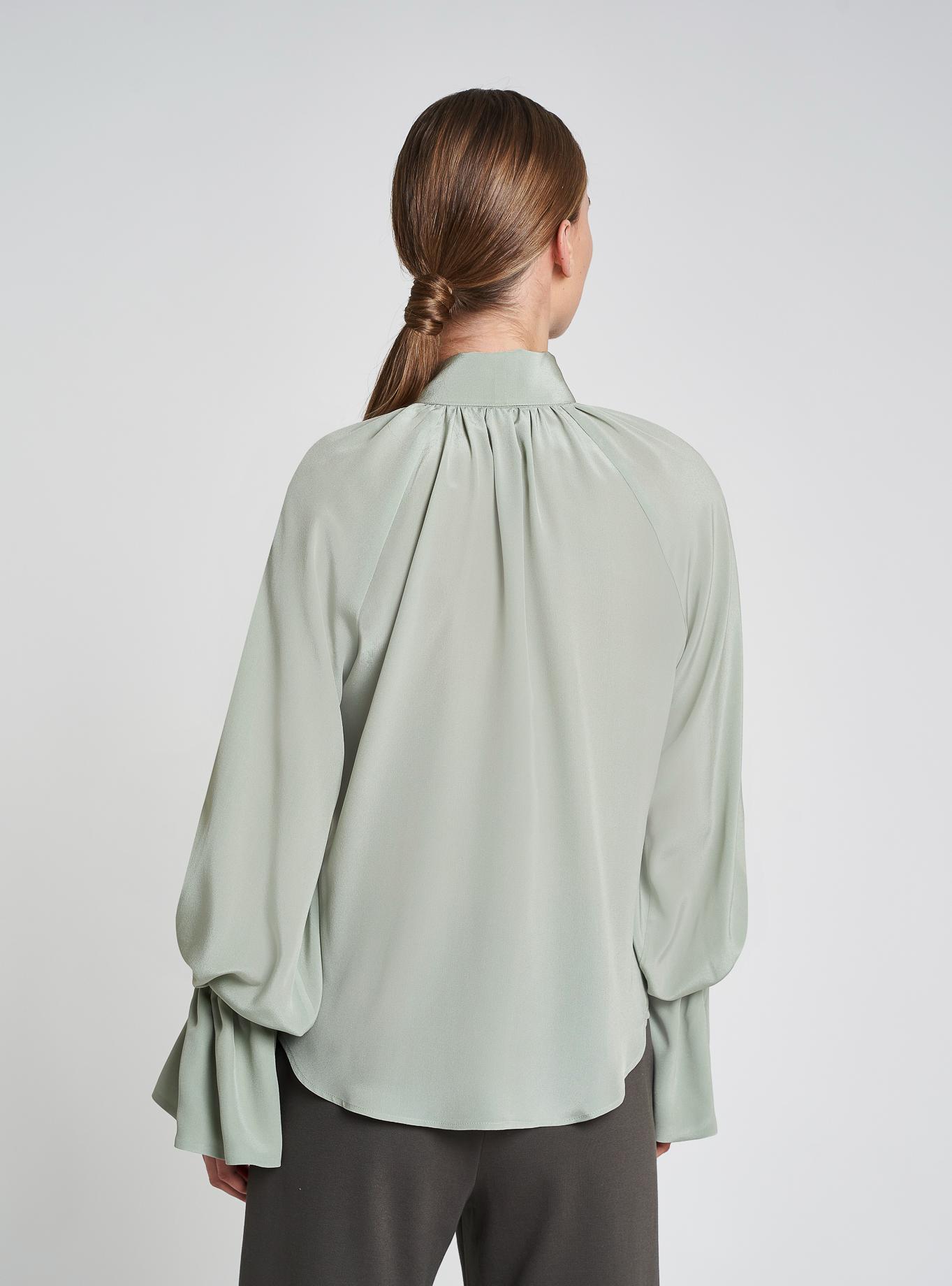Camicia vestibilità morbida. Collo con fiocco regolabile. Maniche raglan, con elastico al polso e rouche femminile al fondo. Abbottonatura nascosta. Orlo leggermente stondato, lunghezza fianco basso.