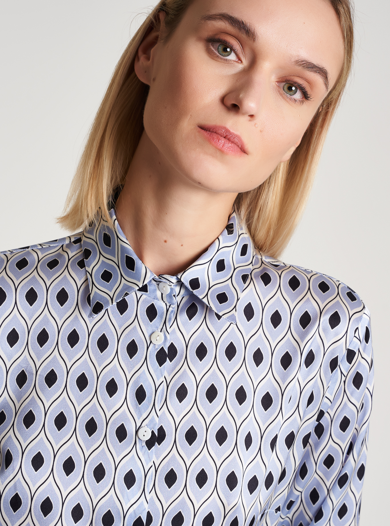 Camicia vestibilità regolare. Collo camicia. Manica regolare con polso un bottone. Camicia medio lunga, lunghezza fianco medio basso.