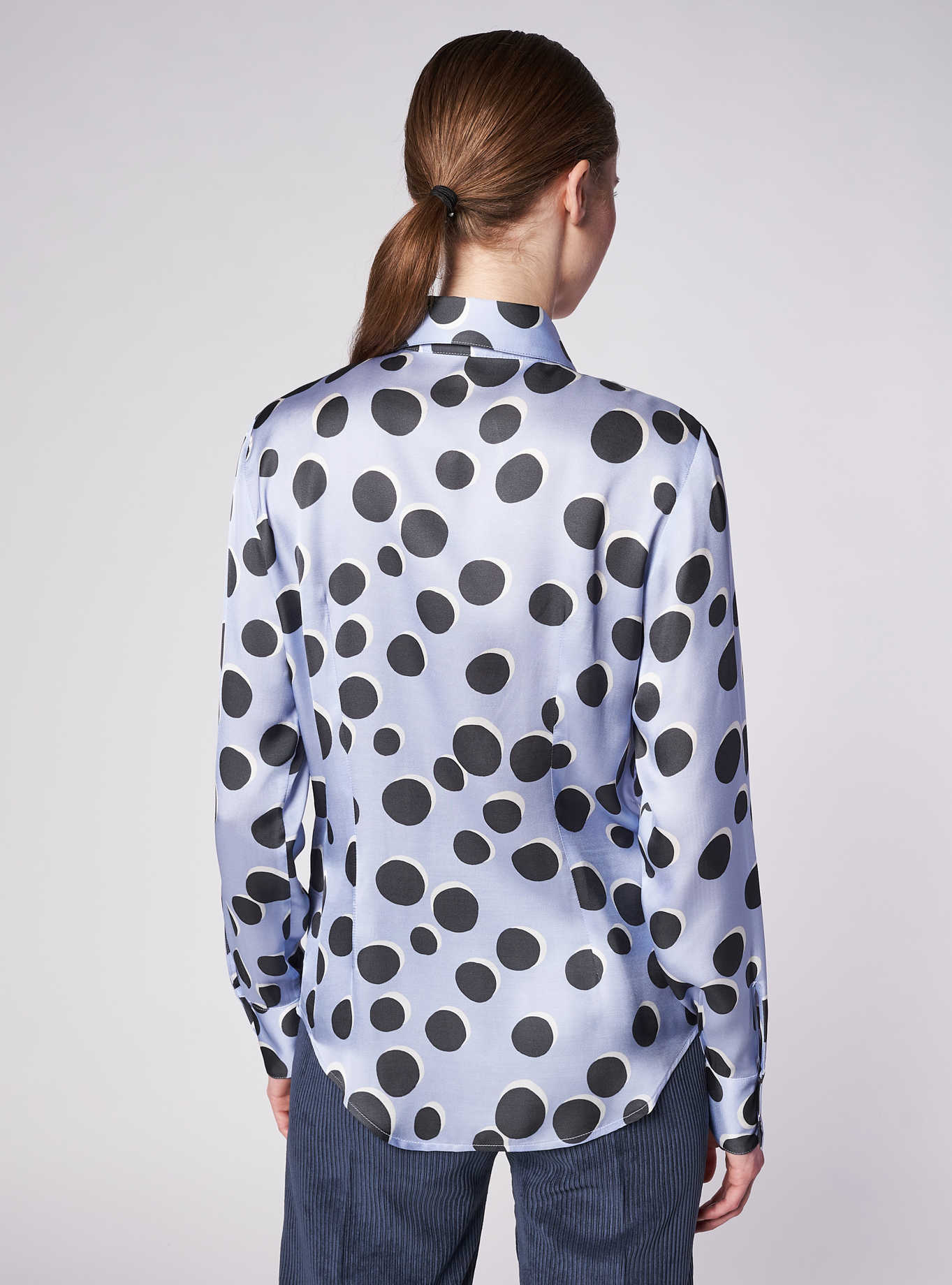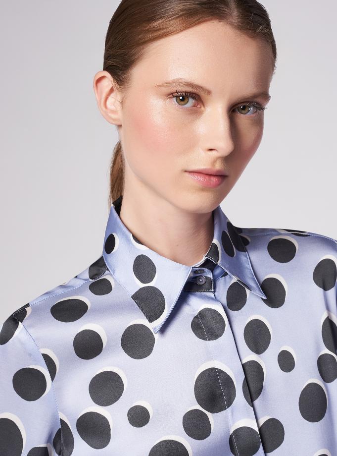 Camicia vestibilità regolare. Collo a camicia, abbottonatura nascosta. Spalla regolare, polso due bottoni. Pinces sul dietro. Camicia medio lunga, lunghezza fianco medio basso.