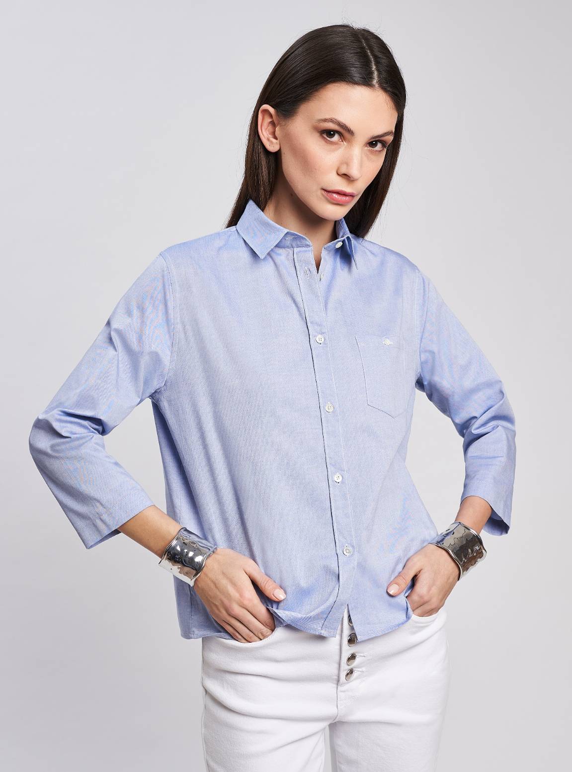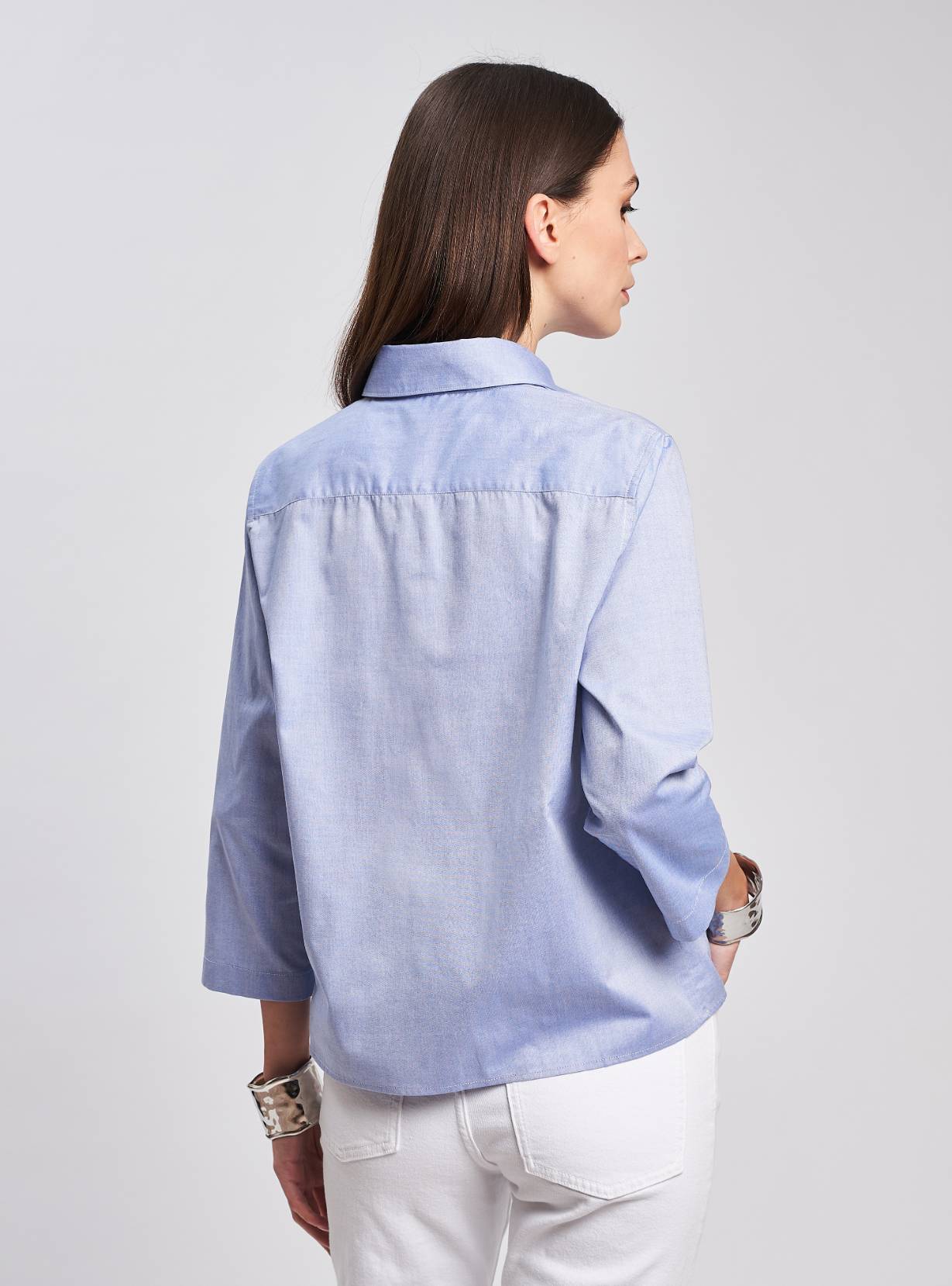 Blusa vestibilità morbida con coulisse e motivo frappa in vita. Scollo a V con bordino, polso importante.