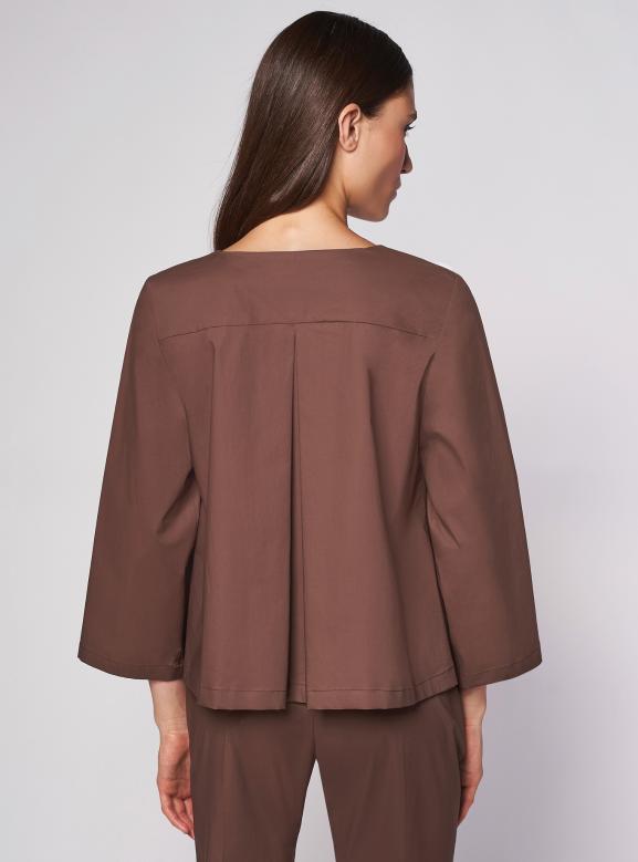 Camicia girocollo femminile, vestibilità regolare. Abbottonatura davanti con bottoni a vista, tasche con patte. Maniche 3/4. Carrè con contropiego dietro. Lunghezza fianco alto