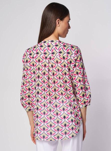Camicia vestibilità morbida. Scollo a "V" con cinturino rotondo piatto alla coreana. Spalla e manica regolare, 3/4 corto con polsino un bottone. Carrè dietro con contropiego. Lunghezza fianco alto.
