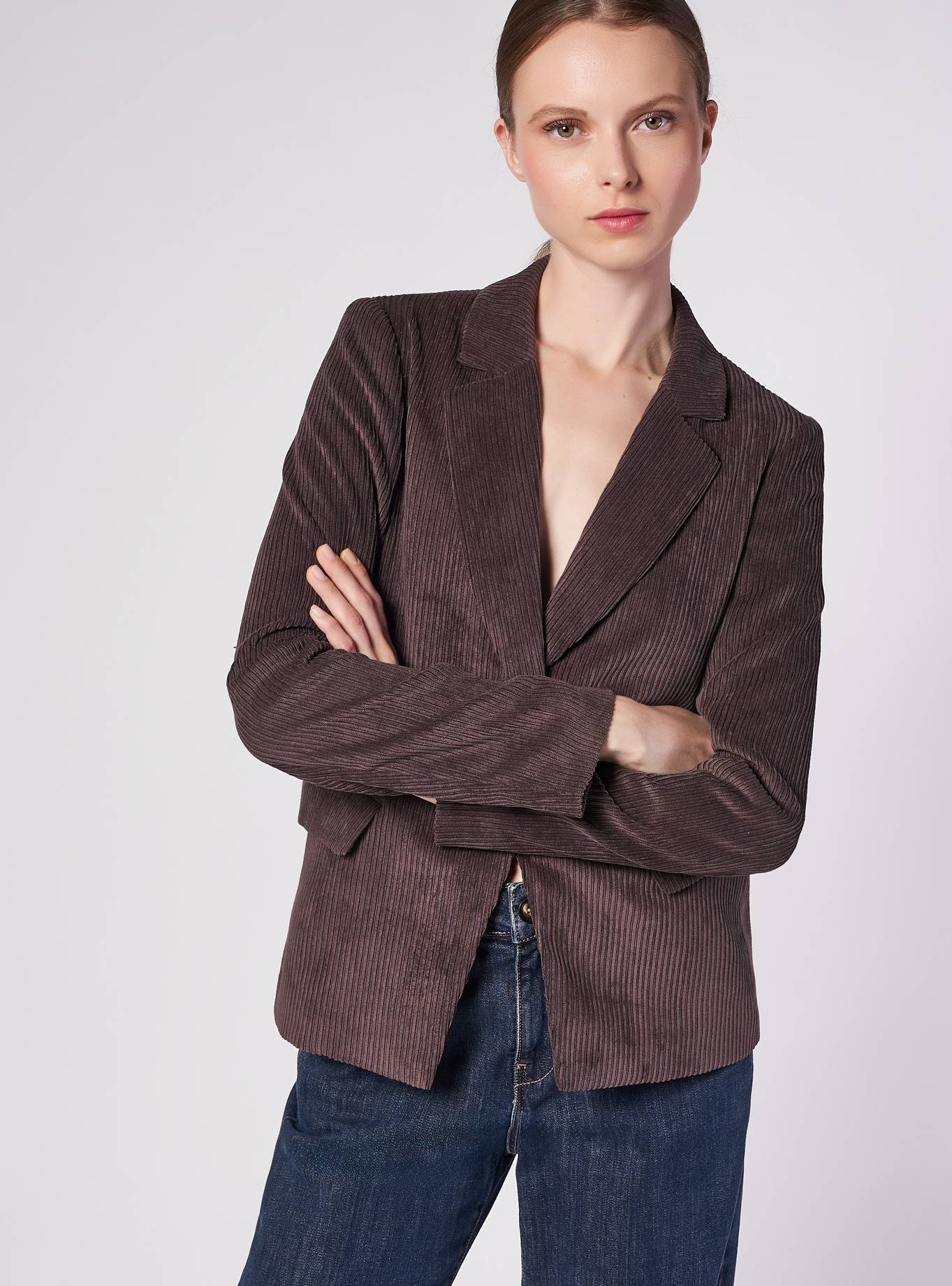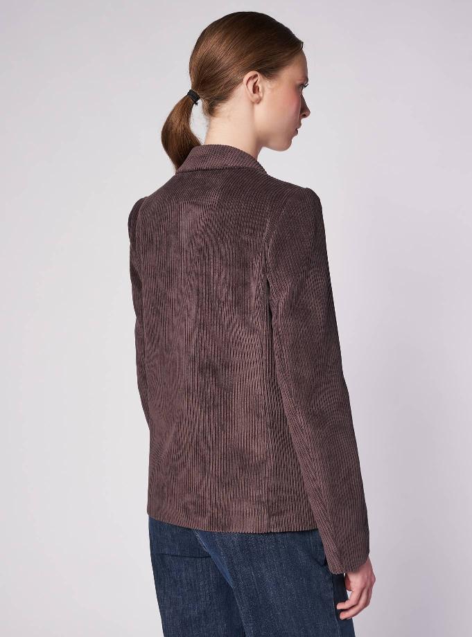 Giacca vestibilità regolare. Monopetto un bottone, rever a V profondo. Tasche a patta sul davanti. Spalla e manica regolare. Fianchetti sul dietro. Lunghezza fianco medio basso.