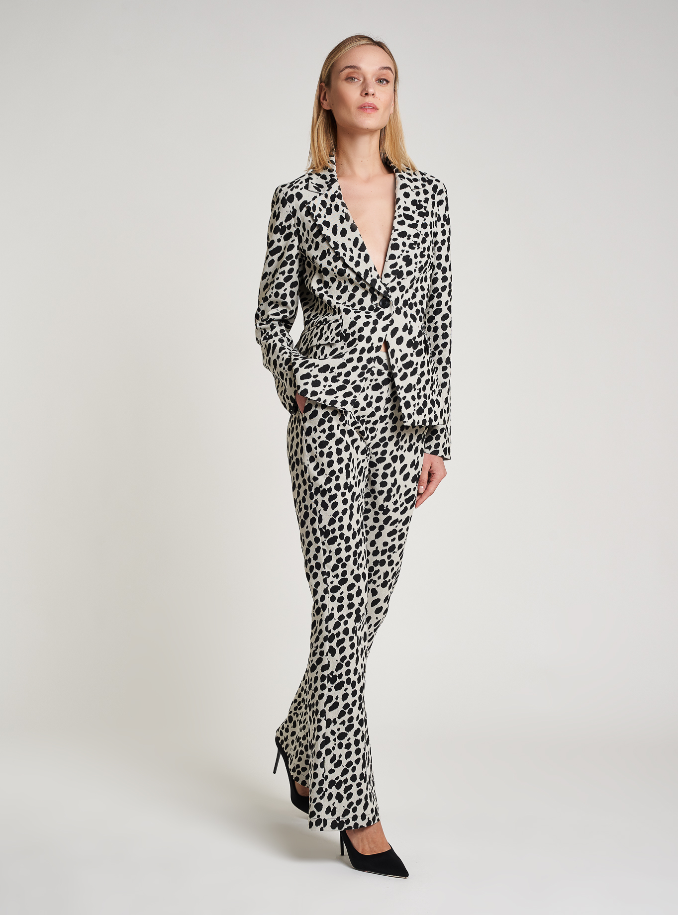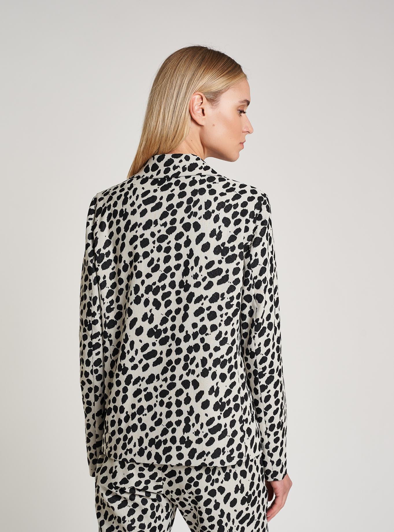Giacca vestibilità regolare. Monopetto un bottone, rever a V profondo. Tasche a patta sul davanti. Spalla e manica regolare. Fianchetti sul dietro. Lunghezza fianco medio basso.