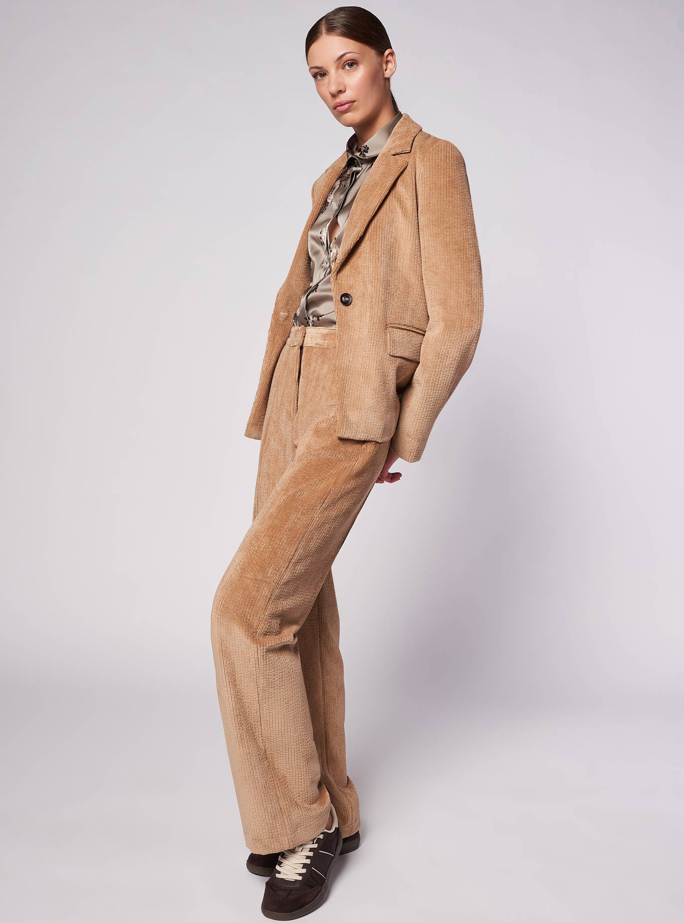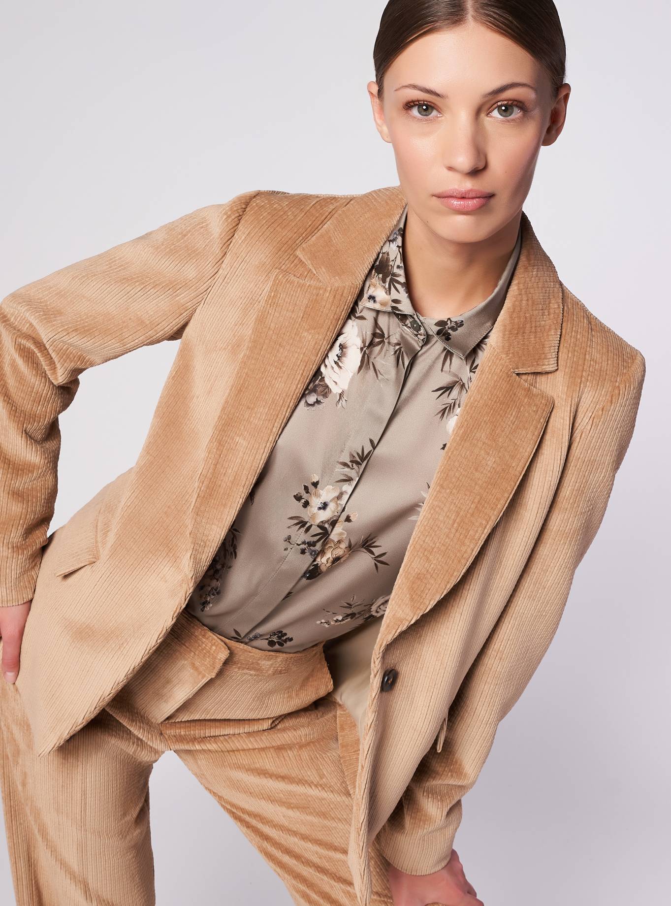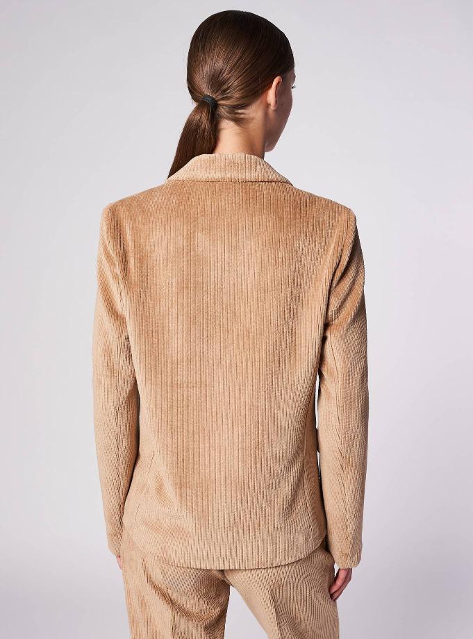 Giacca vestibilità regolare. Monopetto un bottone, rever a V profondo. Tasche a patta sul davanti. Spalla e manica regolare. Fianchetti sul dietro. Giacca lunga, lunghezza fianco basso.