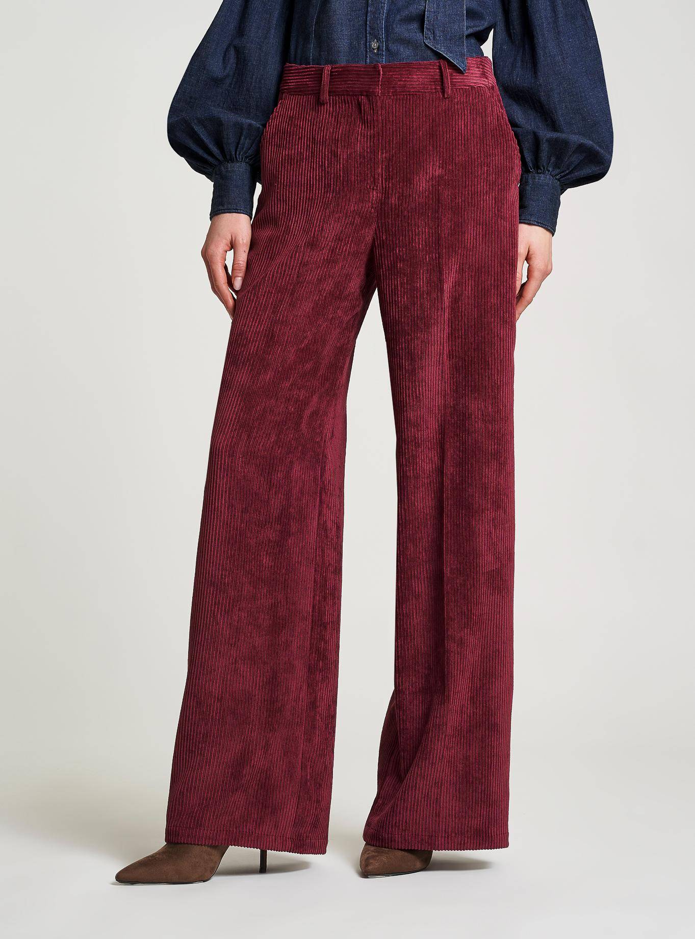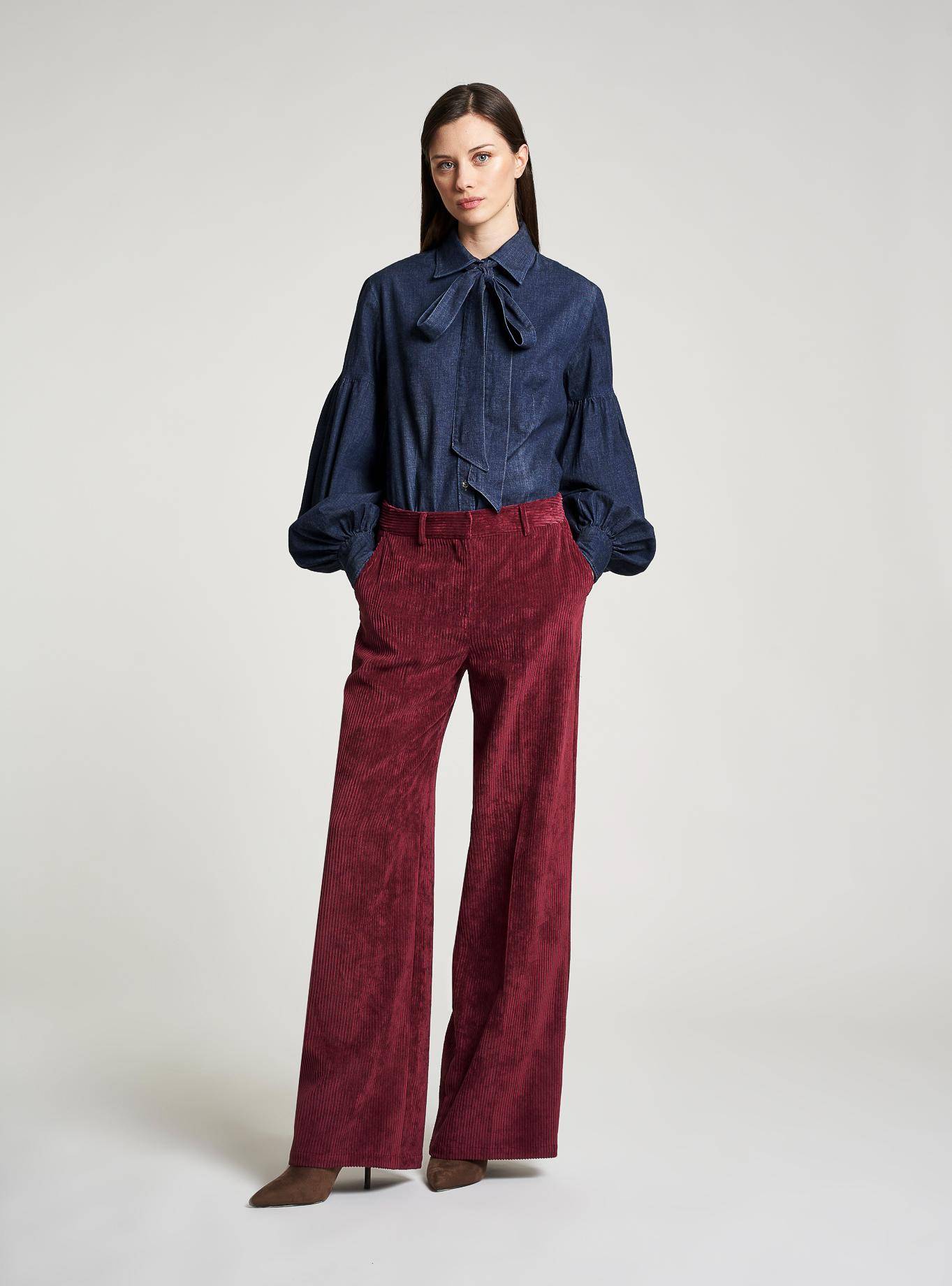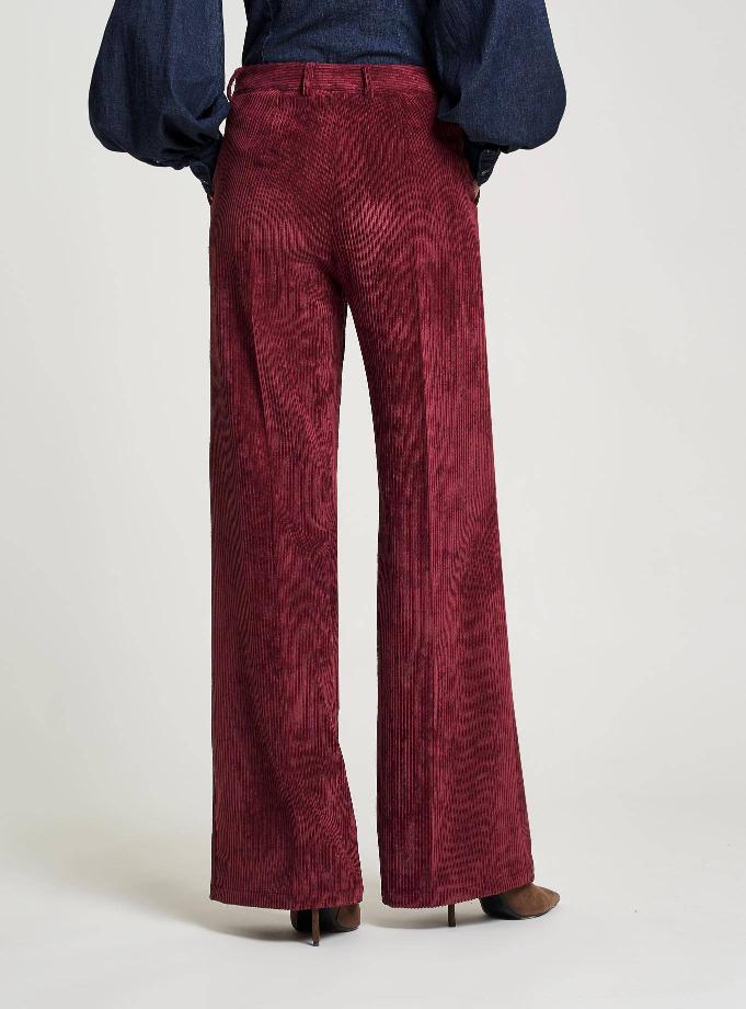 Pantalone a gamba larga, cintone con passanti, punto vita regolare. Tasche alla francese sul davanti. Apertura zip sul centro davanti, nel cintone gancio a uomo e bottone interno. Pinces sul dietro. Lunghezza regolare.