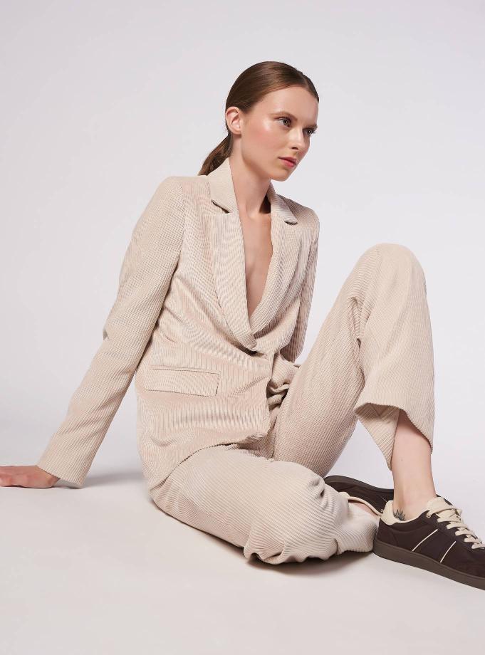 Pantalone vestibilità regolare gamba dritta. Cintone piatto sul davanti e dettaglio elastico inserito nel centro dietro per dar maggior comodità e per perfezionare la vestibilità del punto vita. Punto vita/fianco regolare leggermente sceso. Tasche alla francese sul davanti. Apertura zip sul centro davanti, nel cintone gancio e bottone interno. Lunghezza sotto la caviglia.