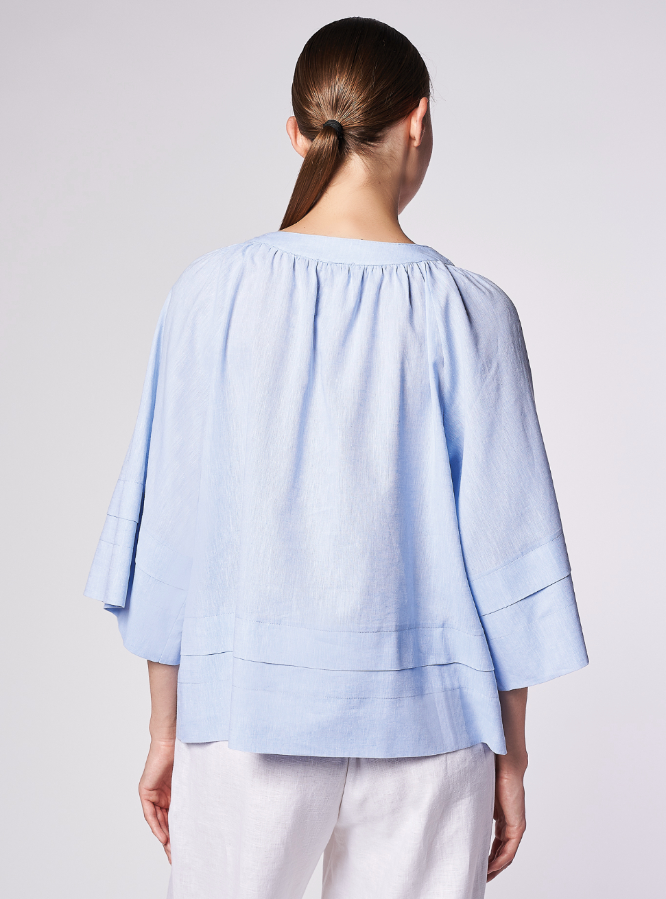 Blusa vestibilità morbida con scollo squadrato femminile. Leggera arricciatura lungo il bordo scollo. Manica ampia 3/4 svasata al fondo. Motivo di pieghe a fondo manica e all'orlo. Lunghezza fianco