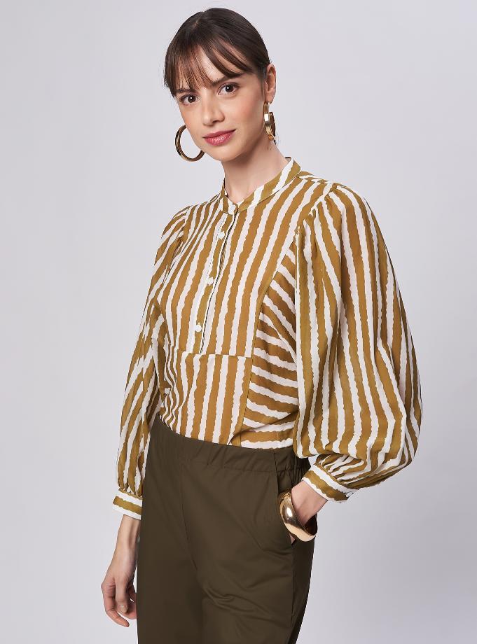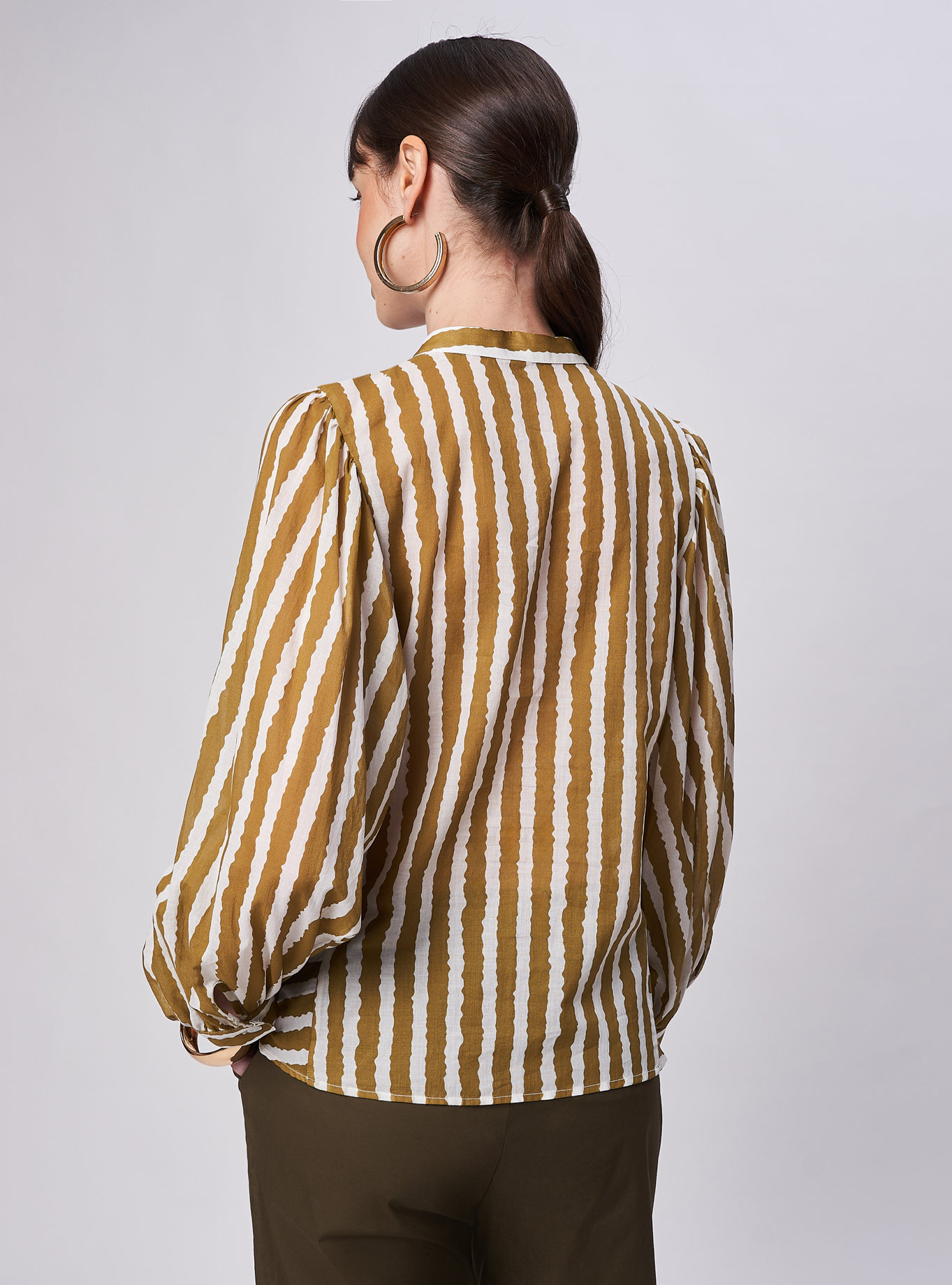 Blusa morbida con collo alla coreana e allacciatura a polo e bottoni nascosti. Motivo di tagli davanti. Manica ampia con arriccio sulle spalle e all'attaccatura polsino per dare volume. Manica 3/4 con polsino e un bottone.