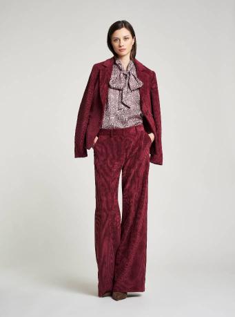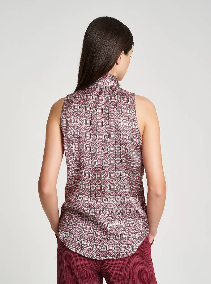 Top vestibilità regolare nella parte alta, svasa leggermente al fondo. Collo con fiocco regolabile, abbottonatura nascosta. Orlo stondato. Lunghezza fianco medio.