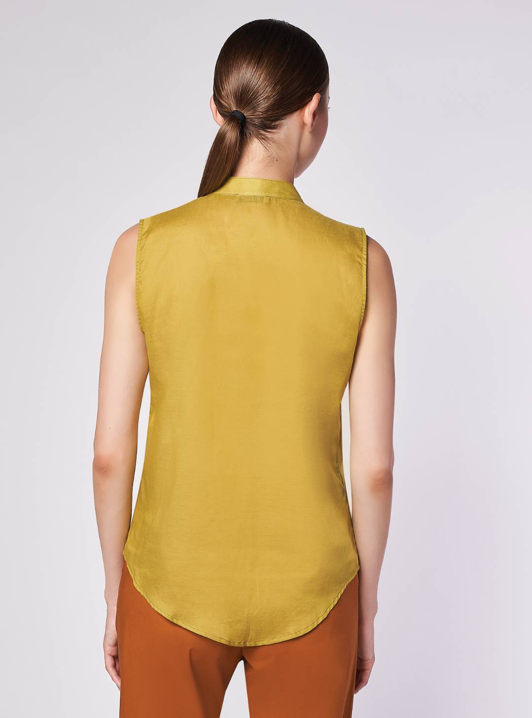 Top vestibilità regolare. Collo alla coreana. Motivo di file di ricche ruches sul davanti. Orlo leggermente stondato.
